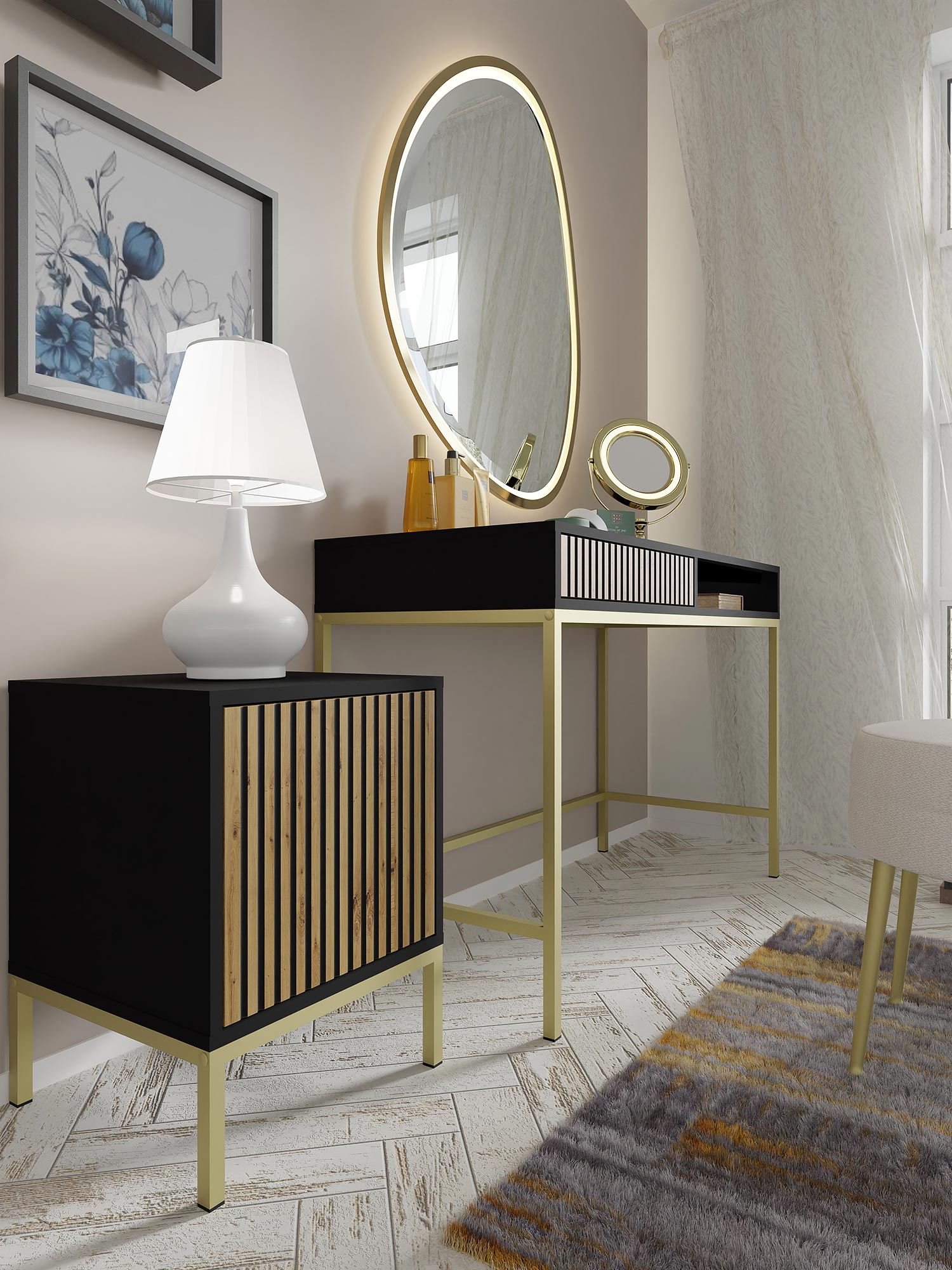 Kontenerek Navia na Metalowych Nogach wyróżnia się nowoczesnym wyglądem oraz solidnością wykonania. Korpus wykonany jest z płyty laminowanej, co gwarantuje trwałość i odporność na codzienne użytkowanie. Fronty z frezowanej płyty MDF, malowane na elegancki kolor dębu artisan i czerni, dodają meblowi nowoczesności i klasy. Metalowe nogi w kolorze złotym podkreślają wyrafinowany charakter kontenerka, dodając mu lekkości i elegancji.