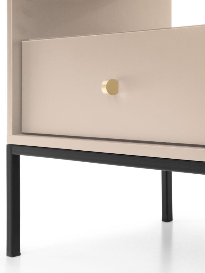 Stolik Nocny Monolit Minimalistyczny Design to doskonały wybór dla tych, którzy cenią sobie nowoczesny minimalizm połączony z subtelnymi, luksusowymi akcentami. Dzięki starannie dobranym kolorom – beż piaskowy, i granat – oraz złotym uchwytom, ten stolik nocny nadaje elegancji każdej sypialni. Podniesiony na delikatnej czarnej podstawie, oferuje nie tylko funkcjonalność, ale także wyrafinowany styl, który stanie się niezastąpionym elementem Twojego wnętrza.