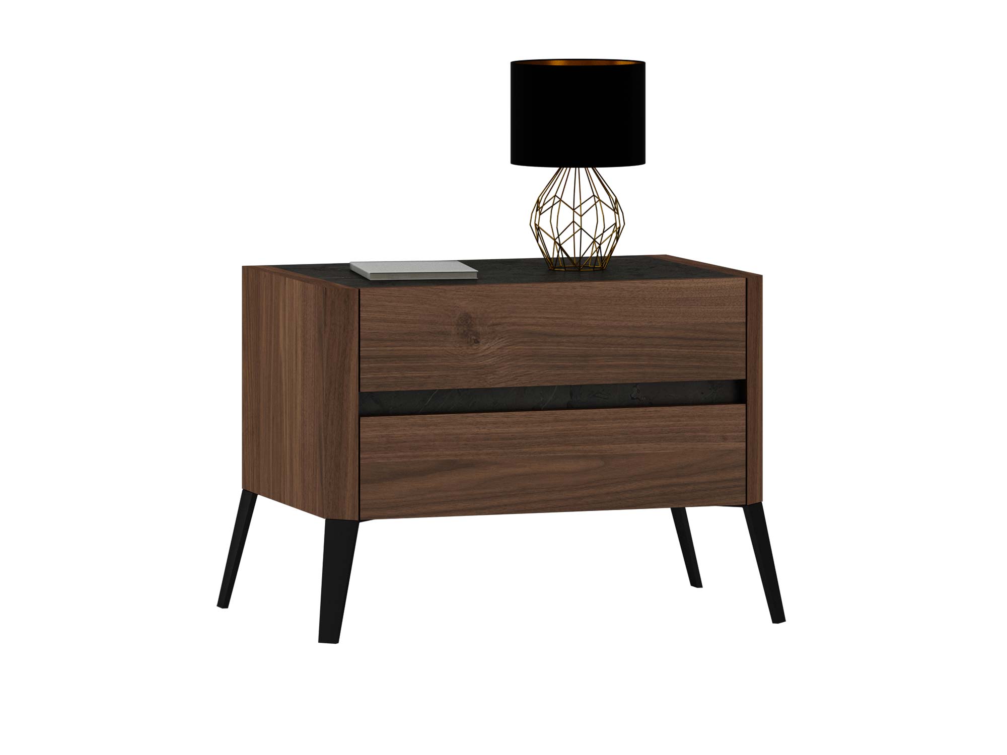 Szafka nocna Lumeria została zaprojektowana z myślą o osobach, które pragną połączyć minimalizm z wyrafinowaną estetyką. Wykonana w kolorze orzecha baltimore, ociepla wnętrze i dodaje mu przytulnego charakteru. Jej blat z szarego kamienia nadaje całości prestiżowego wyglądu i wprowadza kontrast, który przyciąga wzrok.