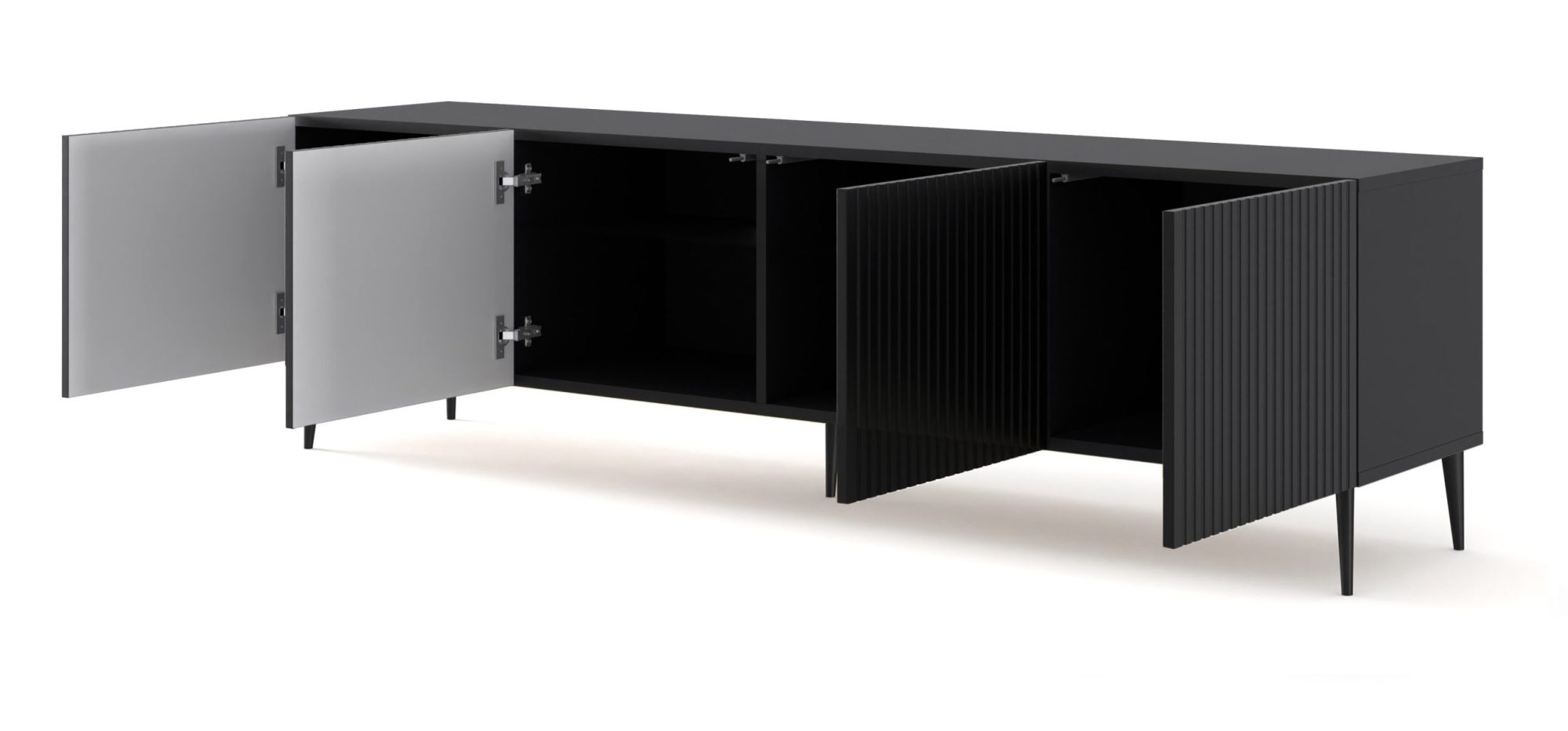 Nowoczesna Duża Szafka RTV Navia to mebel, który wprowadzi do Twojego wnętrza nowoczesność i elegancję. Czarny matowy korpus i fronty nadają wnętrzu wyrafinowanego charakteru, a złote nóżki dodają mu luksusowego wyglądu. Dzięki temu szafka RTV Navia będzie doskonałym uzupełnieniem zarówno minimalistycznych, jak i bardziej klasycznych aranżacji, wnosząc do nich odrobinę nowoczesnego stylu.