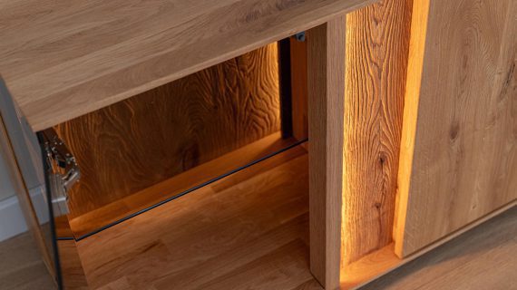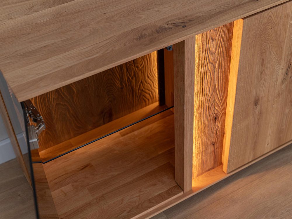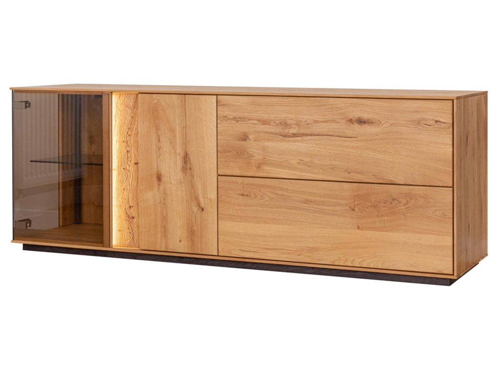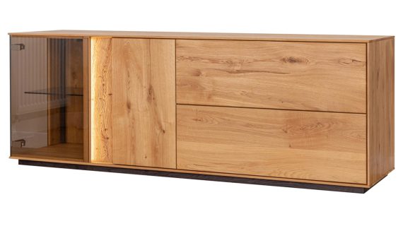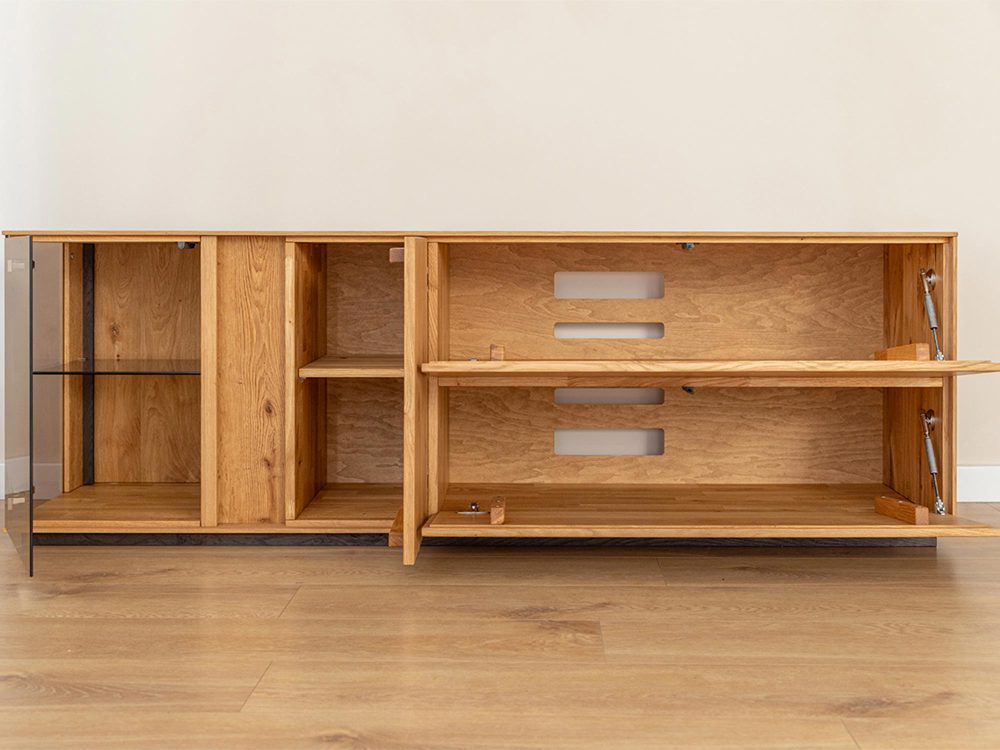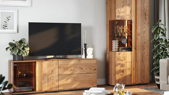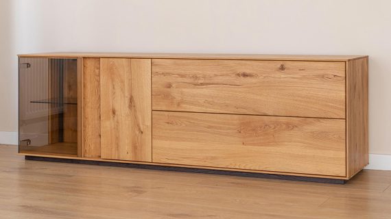 Elegancka Komoda TV z Przeszkleniem Zenovia to kwintesencja połączenia tradycyjnego rzemiosła z aktualnymi trendami wnętrzarskimi. Wykonana z litego dzikiego dębu, ta komoda nie tylko dodaje elegancji każdemu wnętrzu, ale również oferuje praktyczne rozwiązania do przechowywania. Złociste barwy dębu, okraszone naturalnymi słojami i sękami, wprowadzają do wnętrza atmosferę ciepła i spokoju, tworząc przytulną i harmonijną przestrzeń.