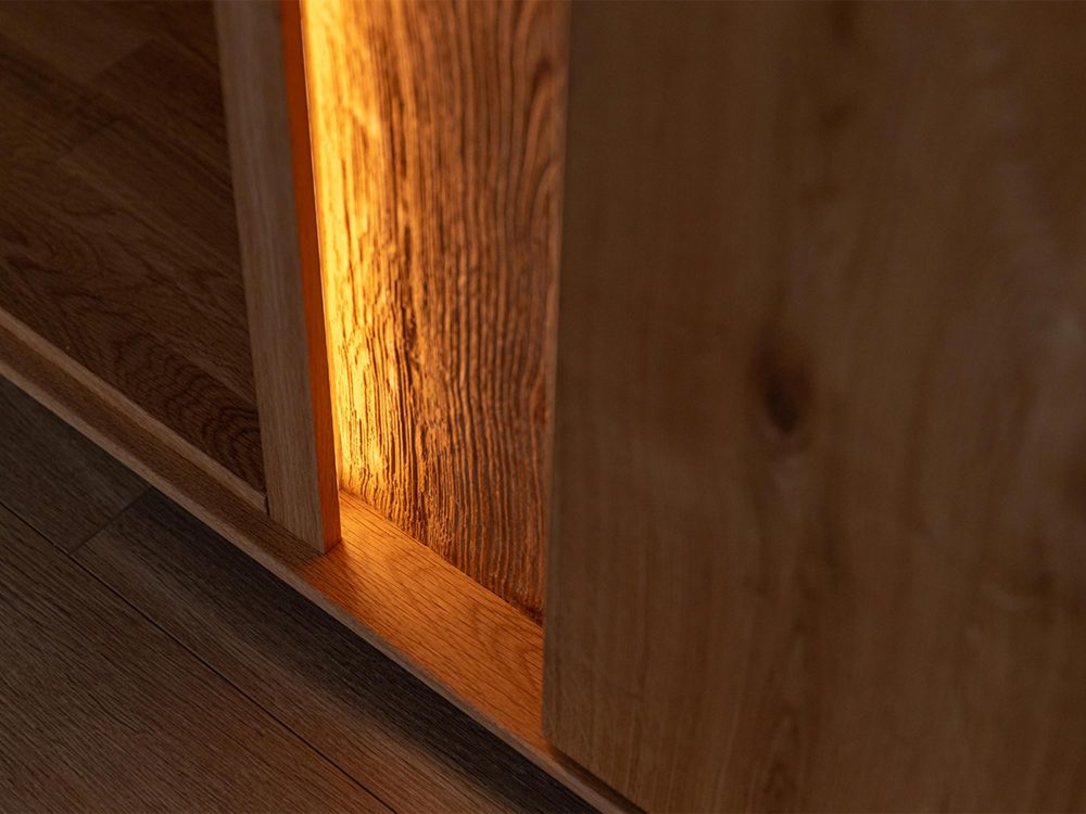 W zestawie z komodą znajduje się oświetlenie, które podkreśla piękno eksponowanych przedmiotów i tworzy przytulną atmosferę w pomieszczeniu. Dzięki temu, Elegancka Komoda TV z Przeszkleniem Zenovia staje się nie tylko praktycznym, ale również dekoracyjnym elementem wnętrza, nadając mu indywidualny charakter i styl.