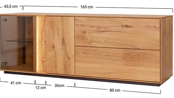 Szeroka Komoda TV Zenovia wyposażona jest w cztery drzwiczki i dwie półki, co umożliwia wygodne przechowywanie i organizację różnych przedmiotów. Z jednej strony, komoda posiada praktyczne szuflady, idealne do przechowywania drobniejszych przedmiotów, takich jak piloty, kable czy płyty DVD. Z drugiej strony, elegancka przeszklona szafka z półką dodaje całości wrażenia lekkości i przestronności, jednocześnie eksponując Twoje ulubione dekoracje.