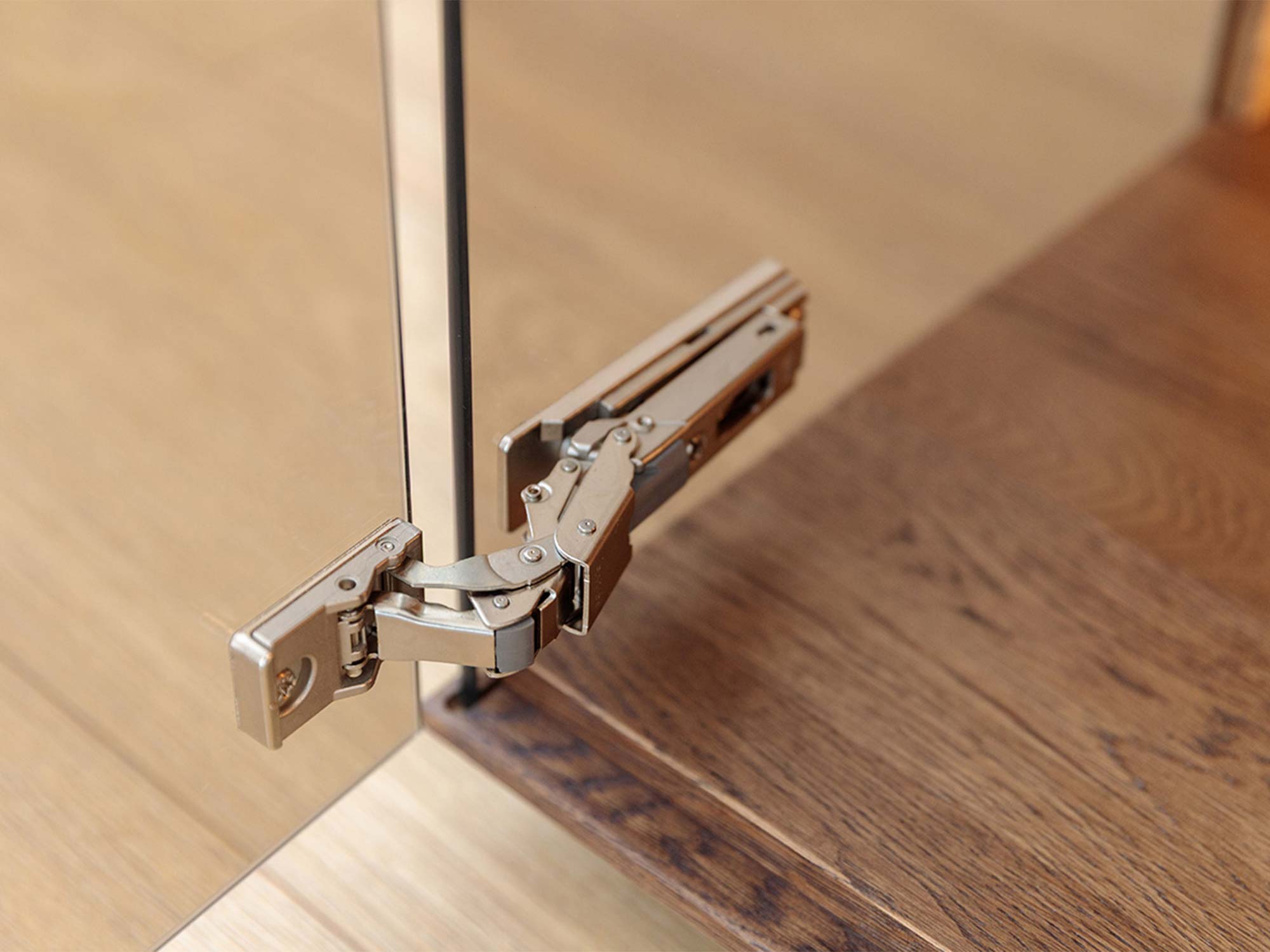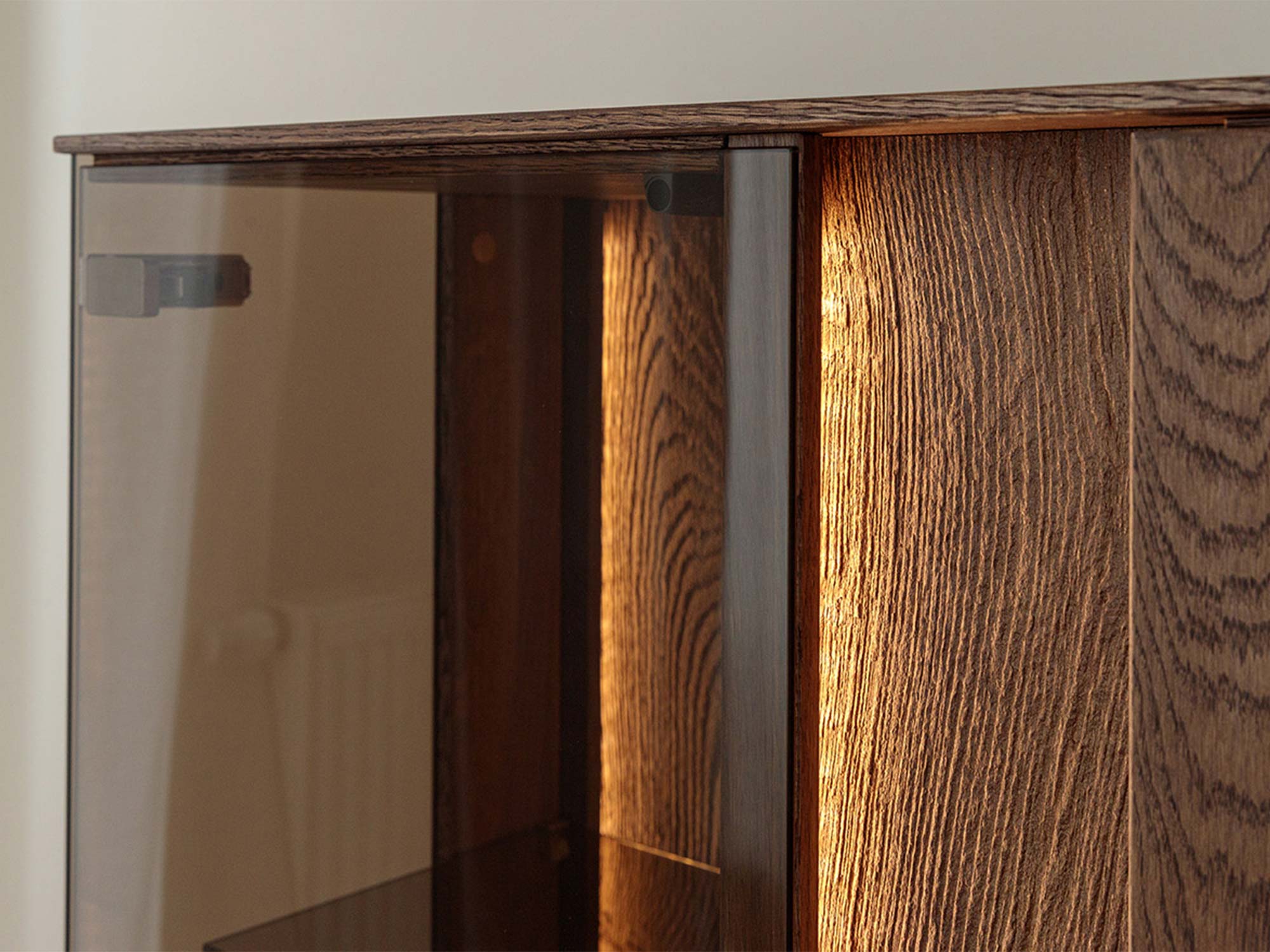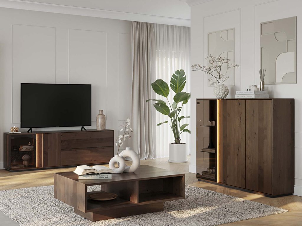 Przeszklona witryna z podświetleniem LED dodaje meblowi lekkości i elegancji. Wyeksponujesz w niej dekoracje, porcelanę lub kolekcję płyt, a delikatne światło stworzy w salonie przytulny klimat wieczornego relaksu. System tip-on umożliwia otwieranie drzwi i szuflad lekkim dotknięciem – bez uchwytów, które mogłyby zaburzyć minimalistyczny charakter bryły. Dzięki temu całość prezentuje się czysto i nowocześnie, pasując zarówno do klasycznych aranżacji, jak i nowoczesnych wnętrz.
