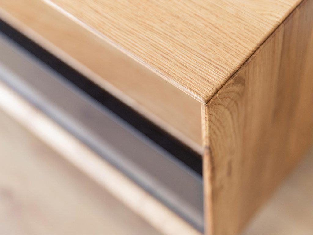 Kyoto została zaprojektowana tak, by łączyć estetykę i porządek w jednej, spójnej formie. Lite drewno dębowe o pięknym rysunku słojów ociepla przestrzeń i nadaje jej naturalnej głębi, a metalowa podstawa wnosi loftową lekkość i stabilność. Otwarta część świetnie eksponuje elektronikę i dekoracje, ułatwiając wentylację urządzeń, natomiast pojemna szuflada pomieści przewody, ładowarki, pady czy zestawy pilotów. Subtelna wstawka z szybą podkreśla nowoczesny charakter mebla, odciążając wizualnie bryłę.