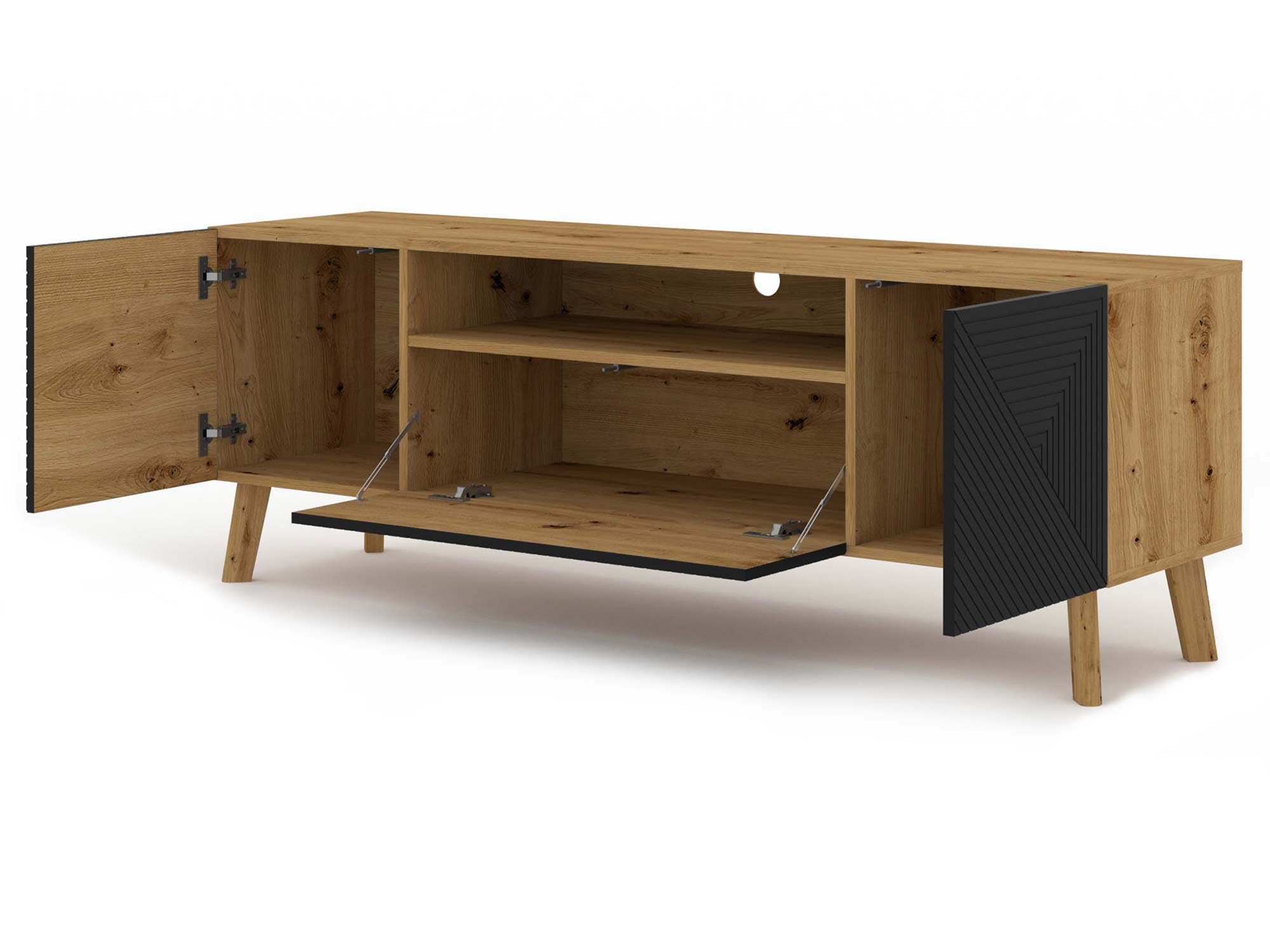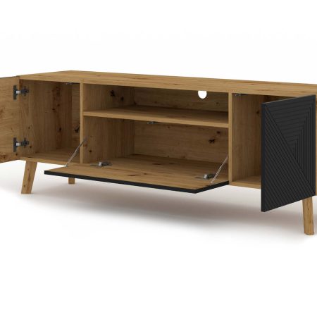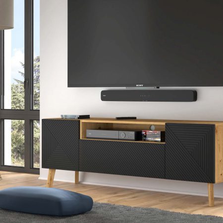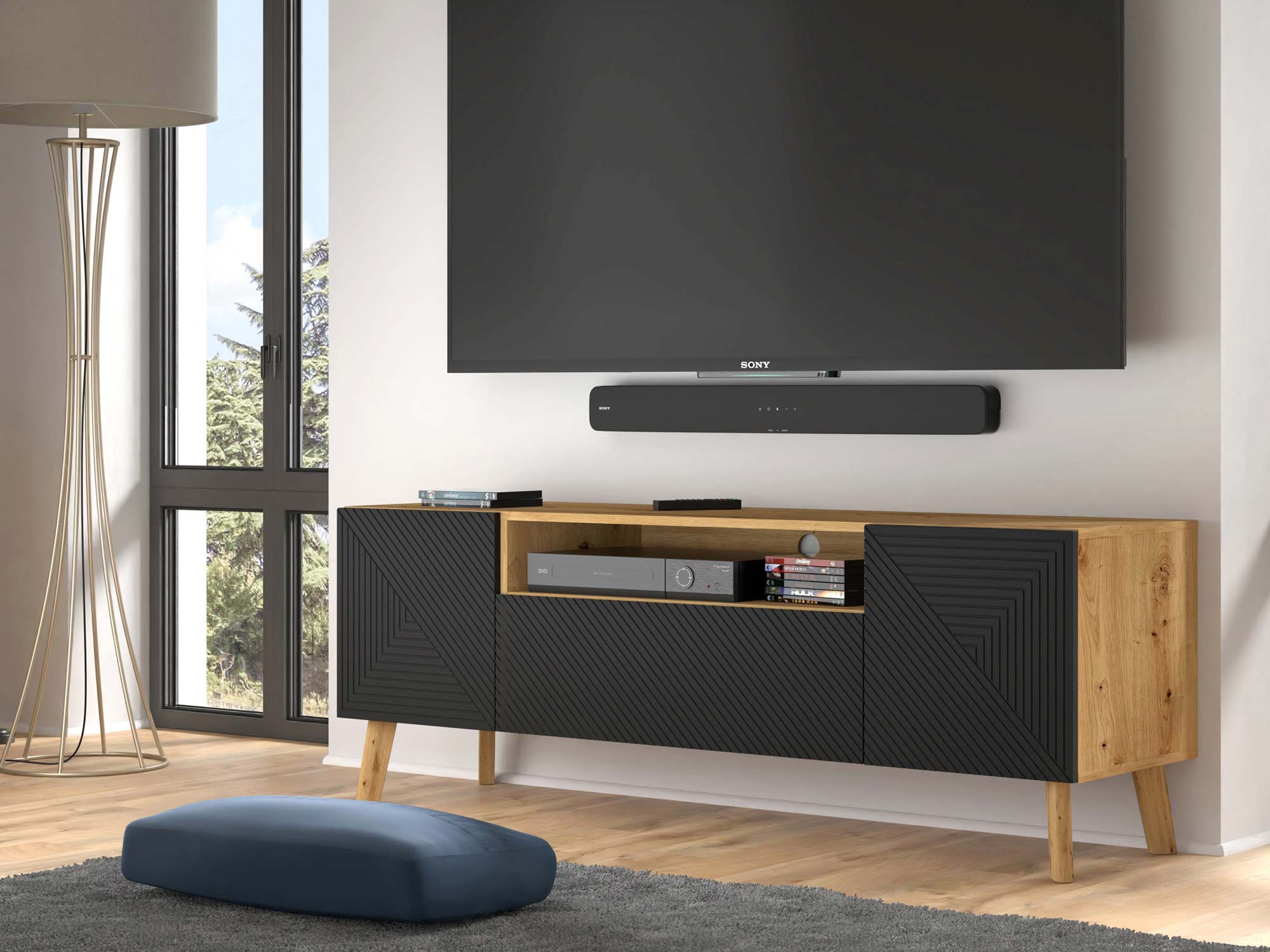 Loftowa szafka RTV IZMIR wyróżnia się oryginalnym połączeniem kolorystycznym: matowej czerni z wybarwieniem dąb artisan. To zestawienie przyciąga uwagę, buduje klimat wnętrza i świetnie komponuje się z surowymi dodatkami, cegłą, szkłem czy betonem. Fronty zostały ozdobione subtelnymi frezami w geometryczne wzory, co dodaje im trójwymiarowości i nowoczesnego charakteru.