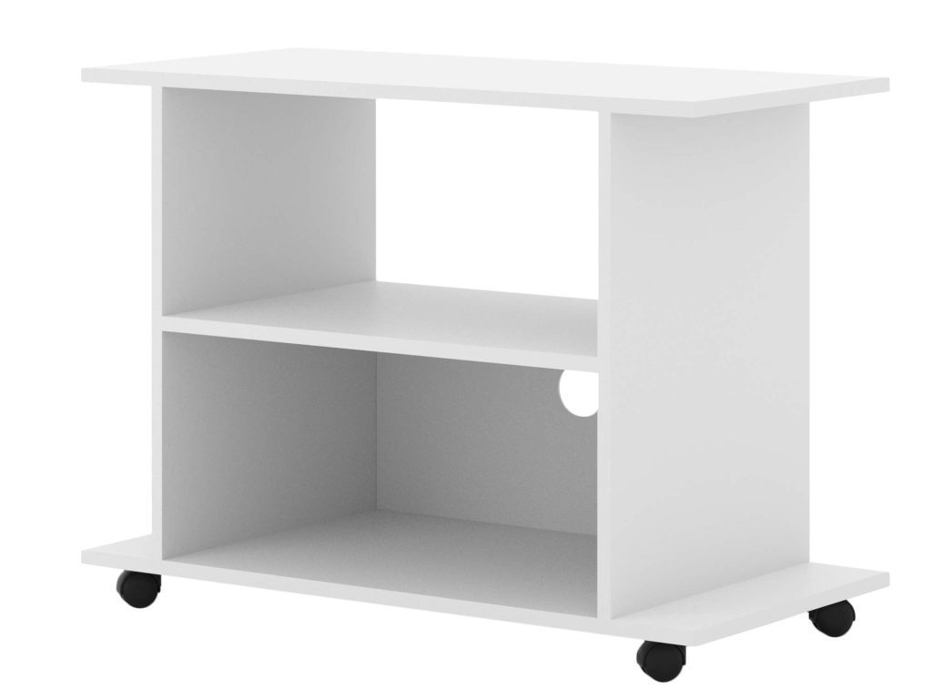Szafka wyposażona jest w dwie przestronne półki, które z łatwością pomieszczą dekoder, konsolę do gier, router czy elementy dekoracyjne. Z tyłu mebla znajduje się estetyczny, okrągły otwór na kable, który pozwala uniknąć plątaniny przewodów – zawsze masz porządek, estetykę i funkcjonalność w jednym.
