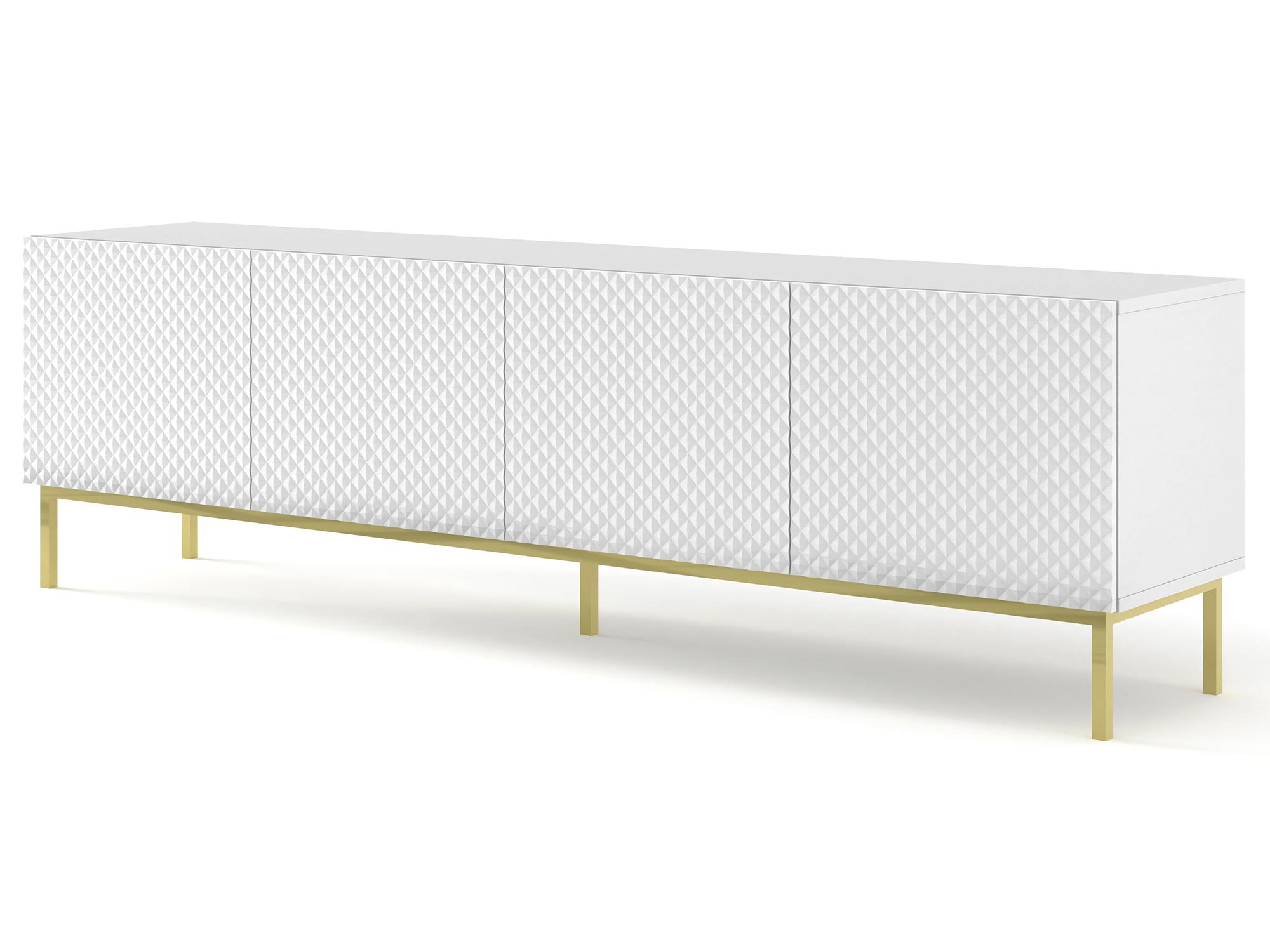 Przestronna Szafka RTV Navia z Ozdobnymi Nóżkami to mebel, który wprowadzi do Twojego wnętrza nowoczesność i elegancję. Biały matowy korpus i fronty w wysokim połysku dodają wnętrzu świeżości i wyrafinowania, a złote nóżki nadają mu luksusowego charakteru. Dzięki temu szafka RTV Navia będzie doskonałym uzupełnieniem zarówno minimalistycznych, jak i bardziej klasycznych aranżacji, wnosząc do nich odrobinę nowoczesnego stylu. Każdy element Przestronnej Szafki RTV Navia z Ozdobnymi Nóżkami został zaprojektowany z myślą o funkcjonalności. Półki i szuflady zapewniają dużo miejsca do przechowywania, co pozwala na utrzymanie porządku i organizacji w Twoim salonie.