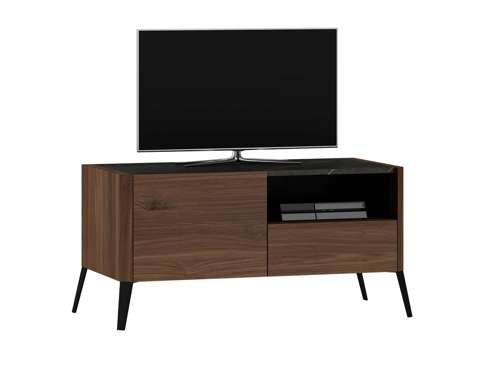 Nowoczesna szafka RTV 1D1S Lumeria to propozycja dla osób, które cenią połączenie klasyki z nowoczesnością. Wykonana w eleganckim odcieniu orzecha baltimore, ociepla przestrzeń, a blat z szarego kamienia nadaje jej charakteru premium. To idealny balans pomiędzy naturalnym ciepłem drewna a nowoczesnym wykończeniem inspirowanym kamiennymi powierzchniami.