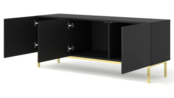 Każdy element Stylowej Szafki RTV 150 cm Navia Nogi Typu Szpilki został zaprojektowany z myślą o funkcjonalności. Półki i szuflady zapewniają dużo miejsca do przechowywania, co pozwala na utrzymanie porządku i organizacji w Twoim salonie. Solidne prowadnice gwarantują płynne i ciche otwieranie oraz zamykanie szuflad, co zwiększa komfort użytkowania.