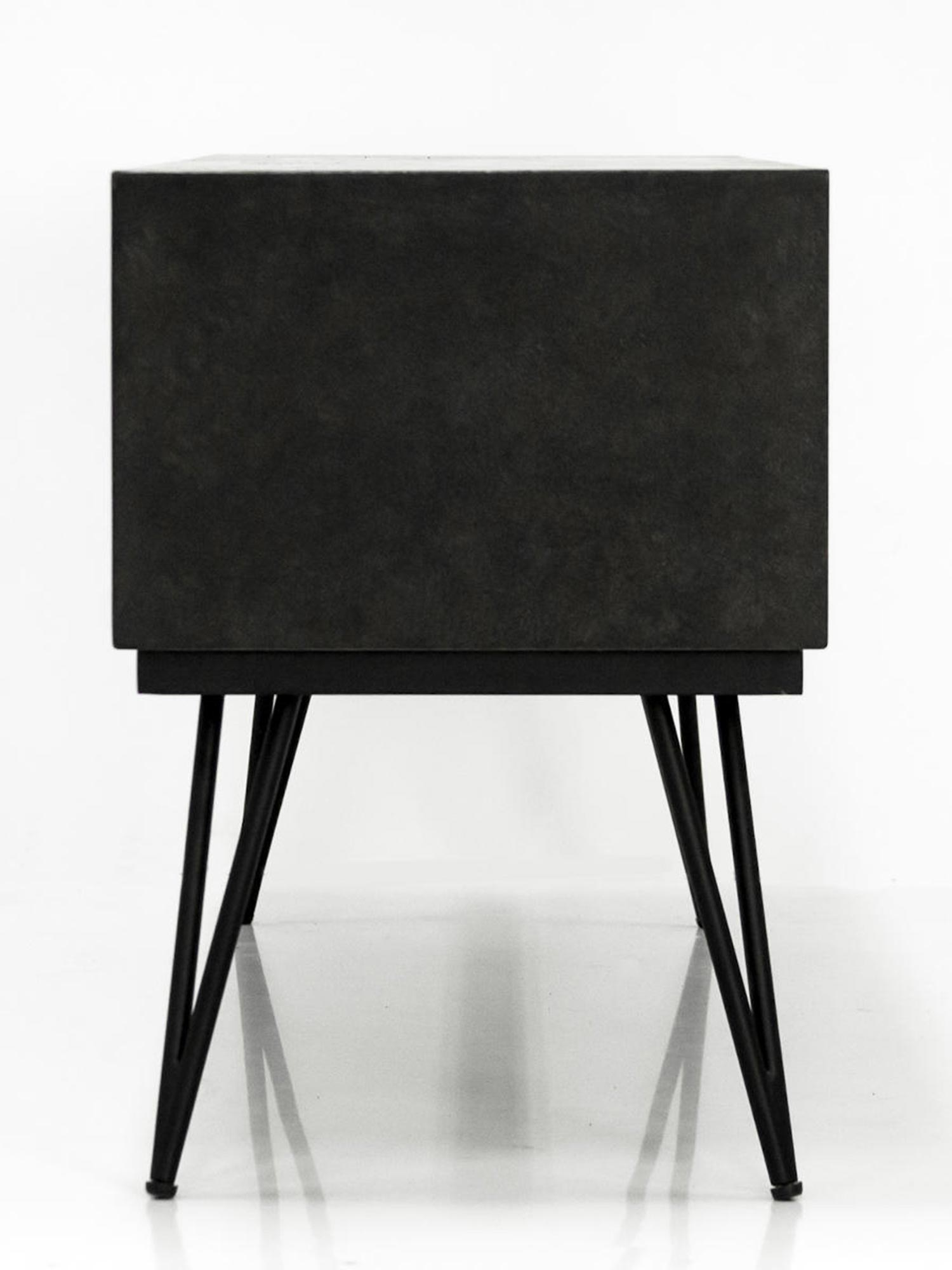 Komoda RTV Mondo to wyjątkowy mebel w stylu retro, który wprowadza do wnętrza elegancję i funkcjonalność. Fronty z litego drewna akacji są wykończone w strukturze 3D, co sprawia, że każdy detal wygląda inaczej, tworząc niepowtarzalny efekt. Korpus w kolorze czarnym z płyty MDF współgra z różnorodnymi odcieniami szarości i beżu, tworząc harmonijną całość. Metalowe nogi w kolorze czarnym dopełniają całość, nadając komodzie stabilność i nowoczesny wygląd. Komoda doskonale pasuje do wnętrz w stylu retro, industrialnym oraz nowoczesnym, wnosząc do przestrzeni wyjątkowy charakter i elegancję.