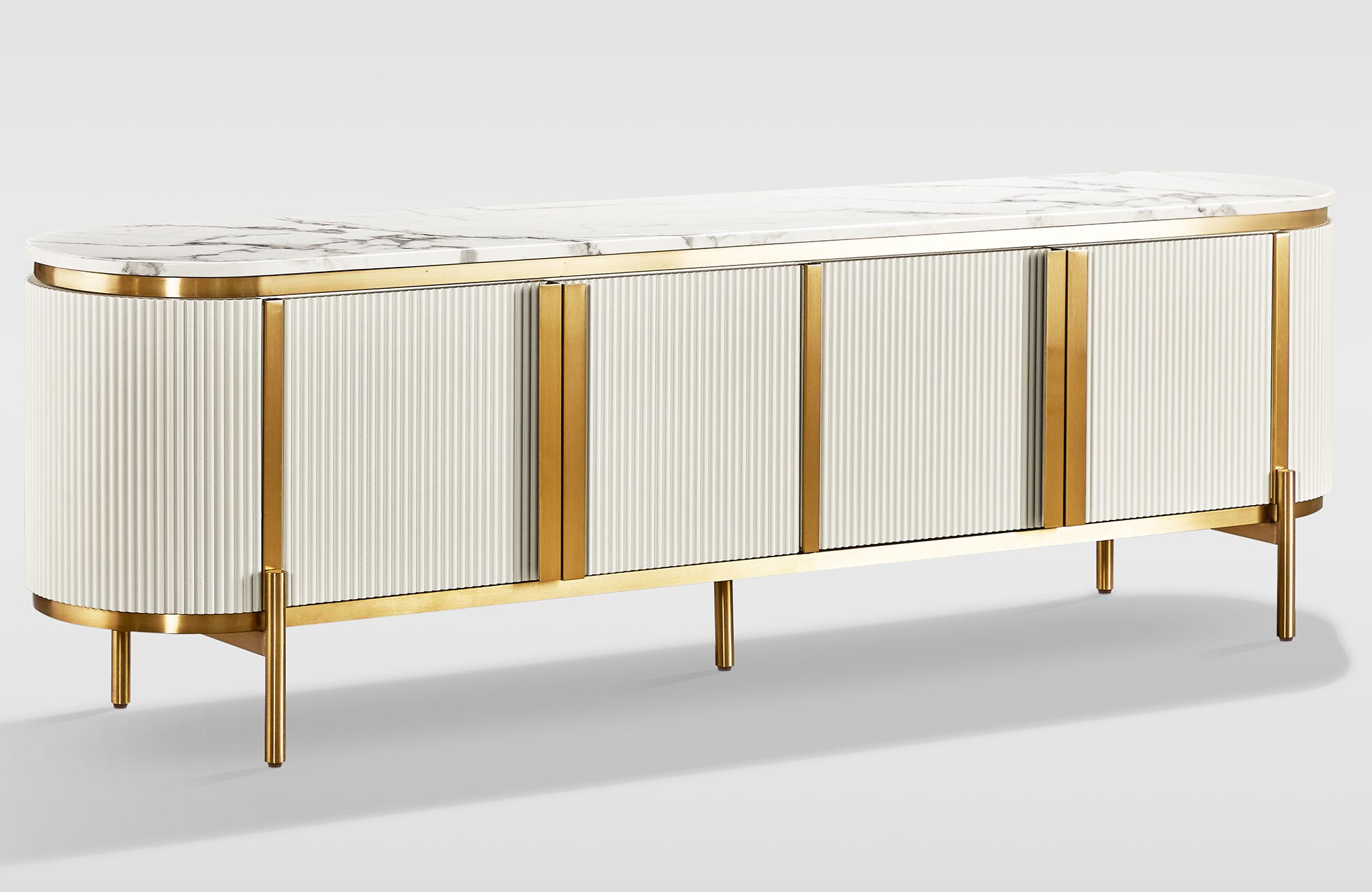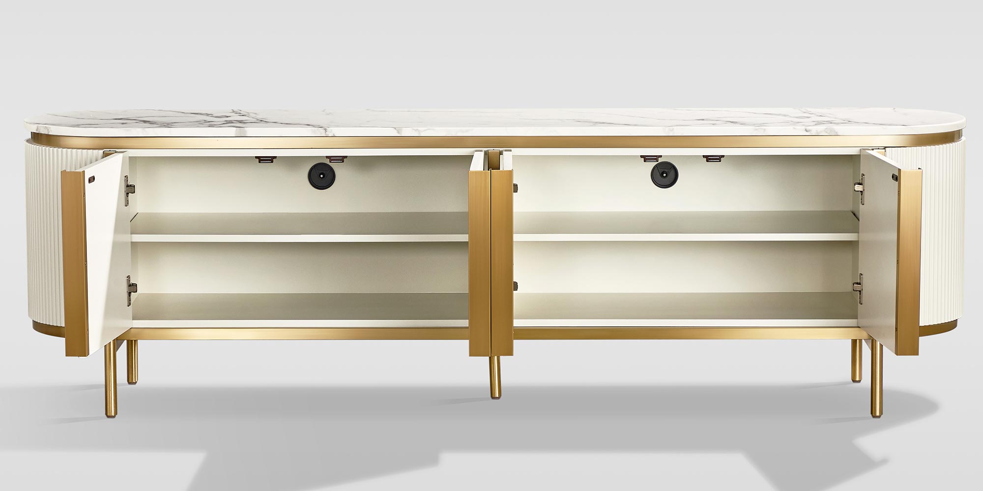 Stylowa komoda rtv w delikatnym kolorze białego ecru, wzbogacona złotymi akcentami i marmurowym blatem. Prosta bryła mebla została uzupełniona ryflowanym drewnem oraz eleganckimi stalowymi uchwytami. Idealna zarówno do nowoczesnych, jak i klasycznych wnętrz.