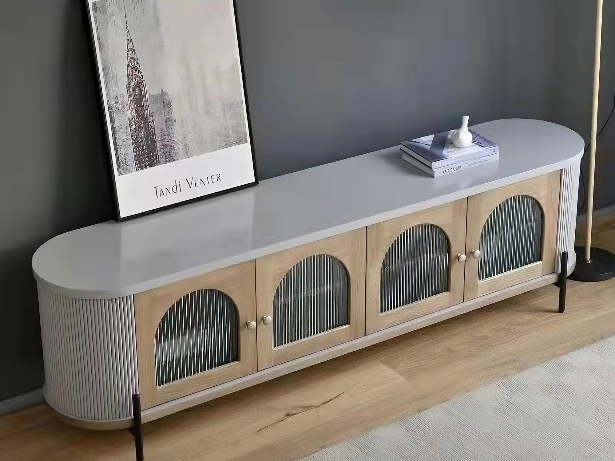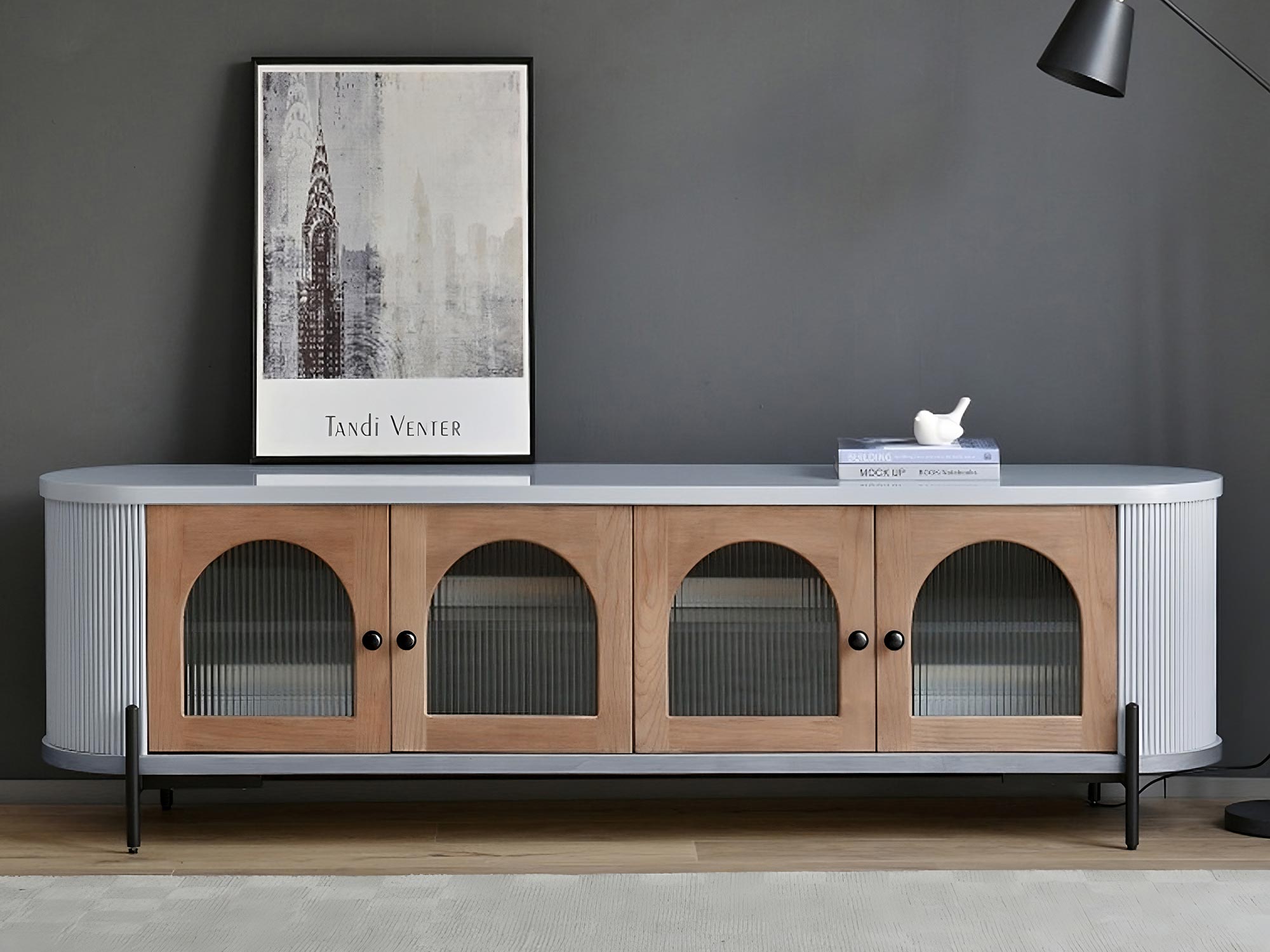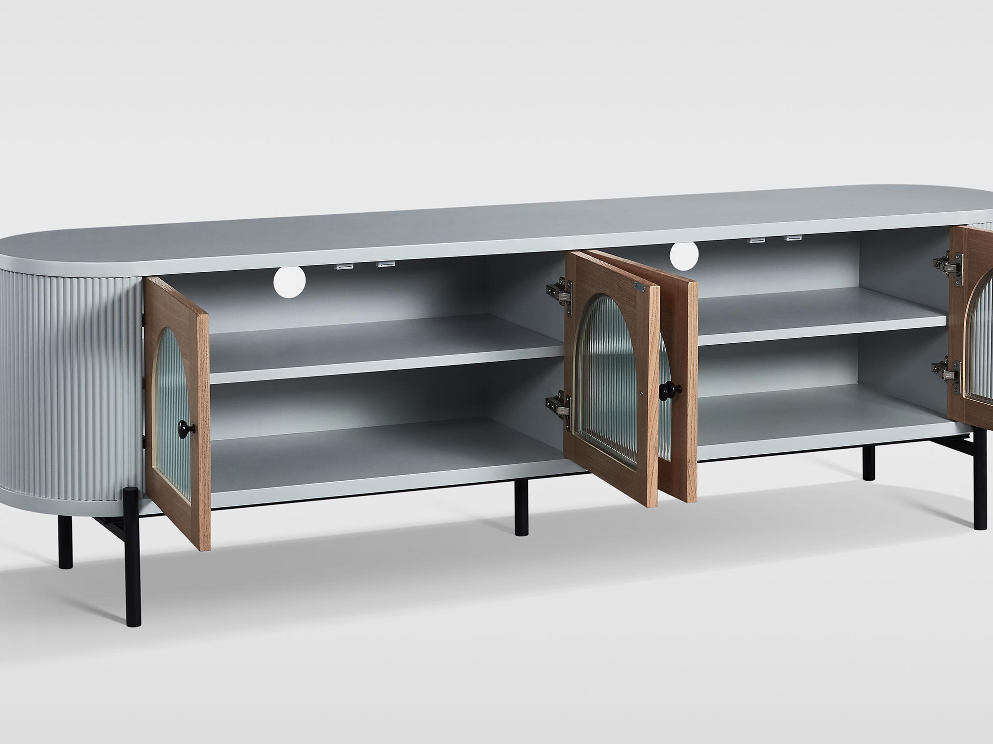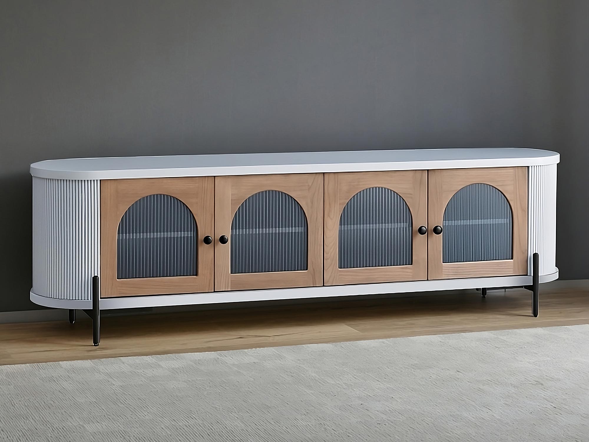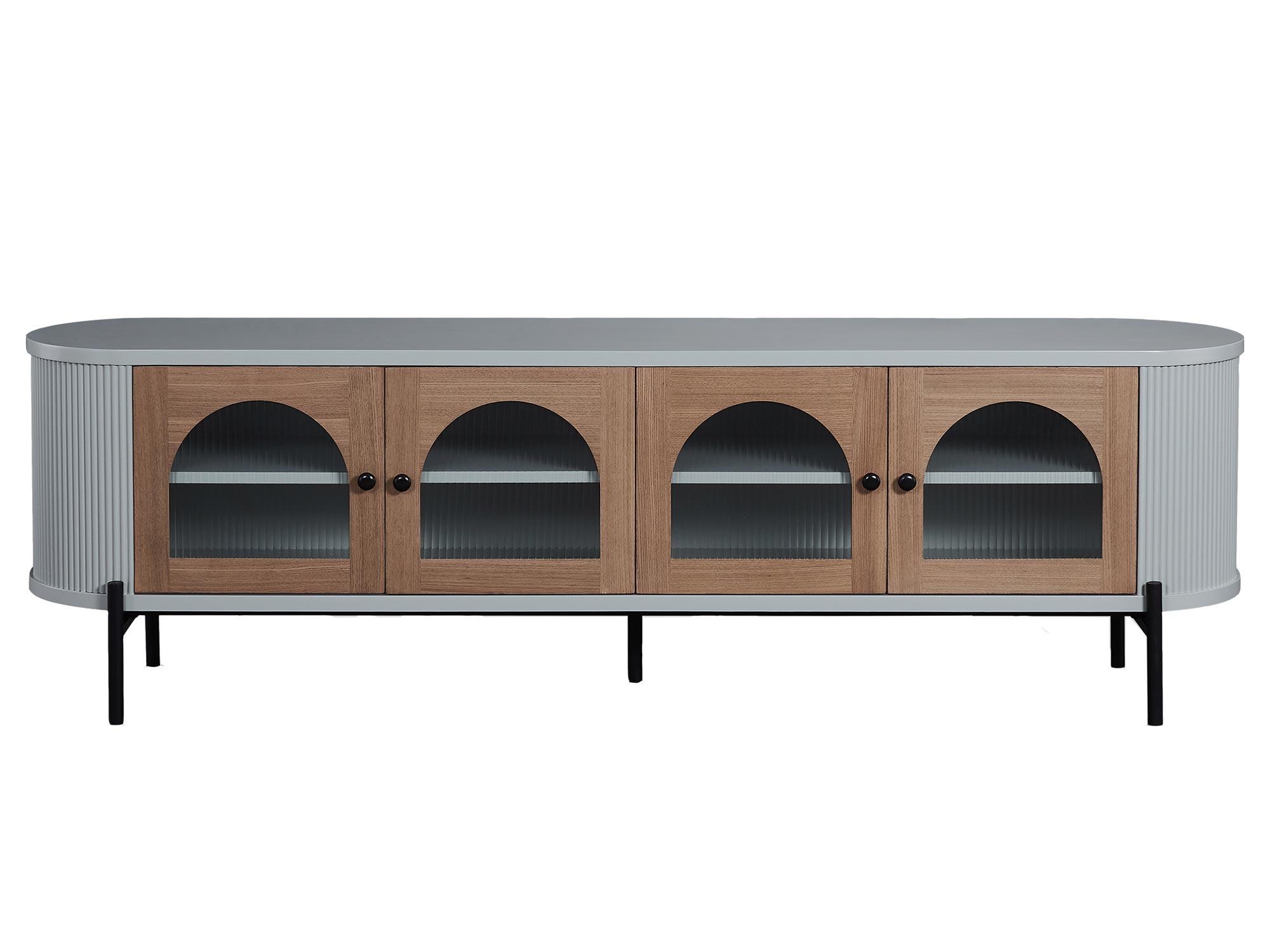 Komoda RTV szara z przeszklonymi drzwiami i ryflowanym drewnem – Eleganza