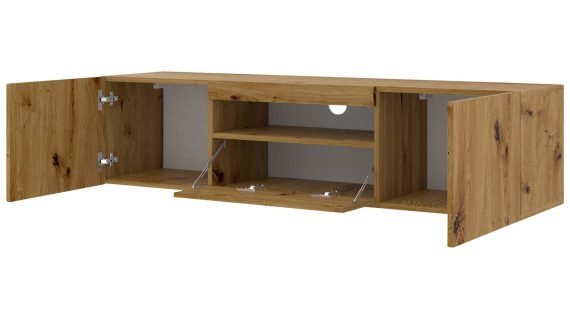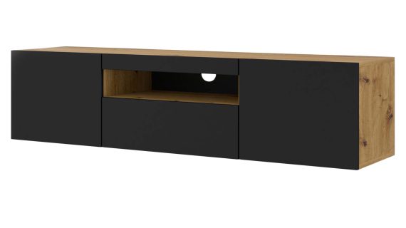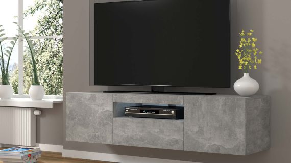 Prezentowana szafka RTV to mebel o klasycznym, ale eleganckim kształcie. Z pewnością będzie pasować do każdego nowoczesnego salonu lub pokoju dziennego. Dostępne są klasyczne kolory, takie jak biel, czerń czy grafit, które doskonale sprawdzą się we wnętrzach w stylu skandynawskim. Jednocześnie dla fanów mebli awangardowych i wyrazistych dostępna jest mniej pospolita kolorystyka, tj. beton, ręcznie robiony dąb lub kombinacje różnych odcieni w dwóch wykończeniach do wyboru.