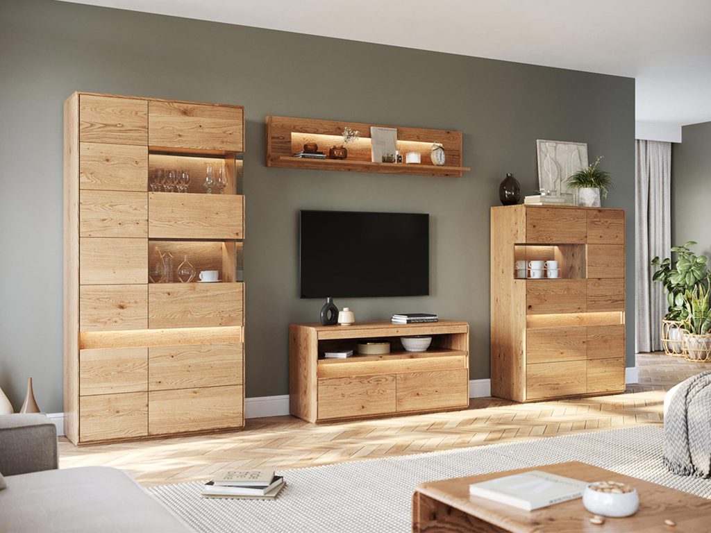 Zobacz, jak zmieni się Twój salon: ustaw TV i soundbar, dodaj ulubione dekoracje, a dąb nada scenie ciepła i równowagi.