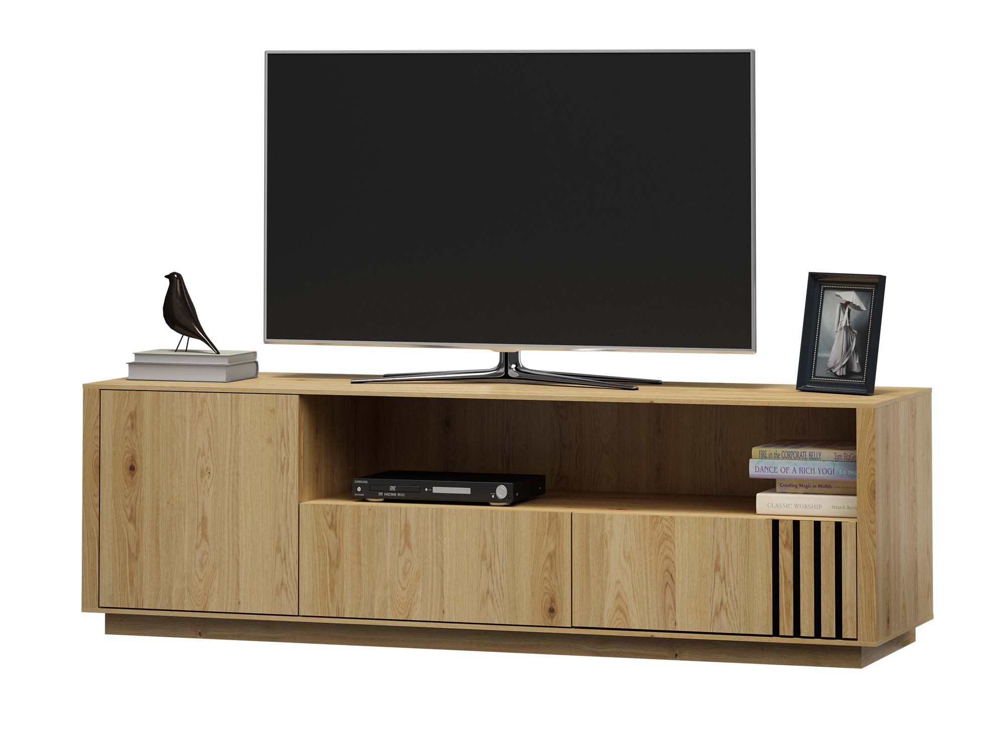 Ta elegancka szafka posiada dwa przestronne szuflady oraz jedną zamykaną szafkę, które zapewniają wystarczająco dużo miejsca na sprzęt multimedialny, akcesoria czy płyty. Dzięki maksymalnemu wysuwowi szuflad dostęp do zawartości jest łatwy i wygodny, co czyni codzienne użytkowanie jeszcze bardziej komfortowym. Dodatkowo, opcjonalny system push to open pozwala otwierać fronty lekkim dotknięciem, nadając całości minimalistycznego charakteru i elegancji.