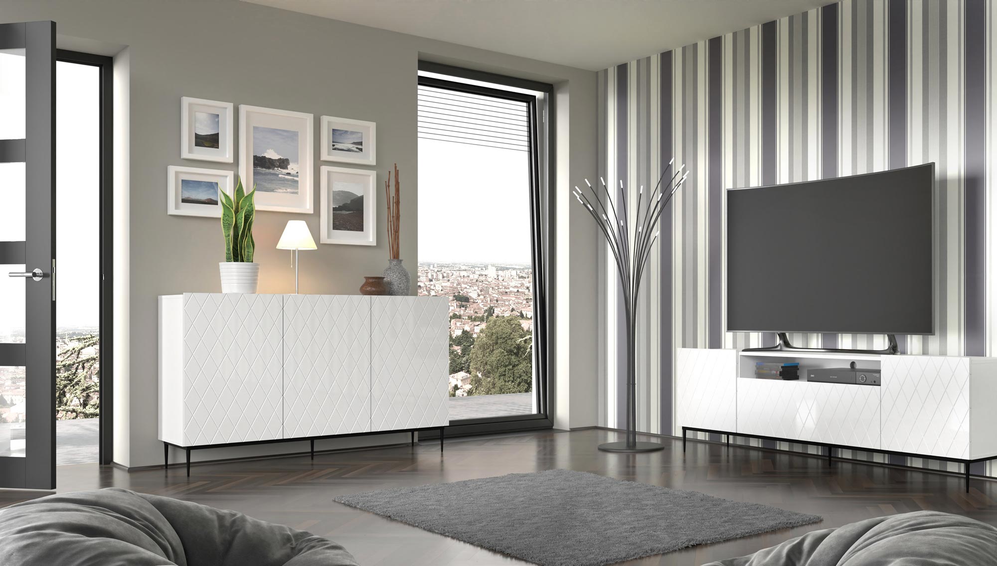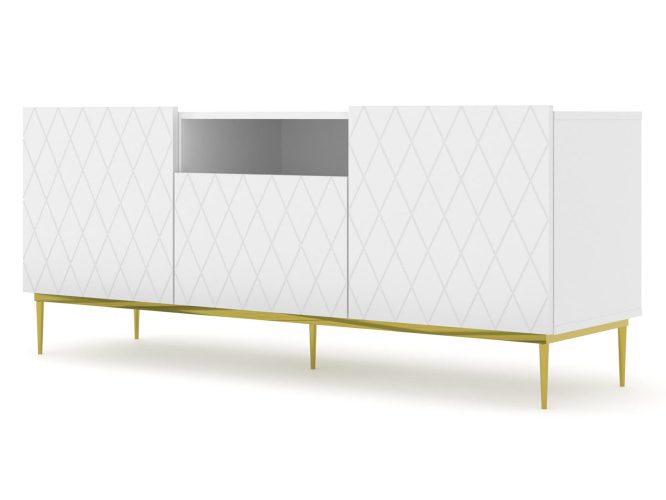 Szafka RTV Bellagio z Atrakcyjnymi Ozdobnymi Frontami to idealne rozwiązanie dla osób poszukujących nowoczesnego, eleganckiego i funkcjonalnego mebla do swojego salonu. Dzięki atrakcyjnym zdobionym frontom oraz eleganckim metalowym nogom w formie ramy, ta szafka wyróżnia się luksusowym wyglądem i wysoką jakością wykonania. Posiada trzy zamknięte półki oraz jedną otwartą, co zapewnia bardzo dużą pojemność i wygodę użytkowania.