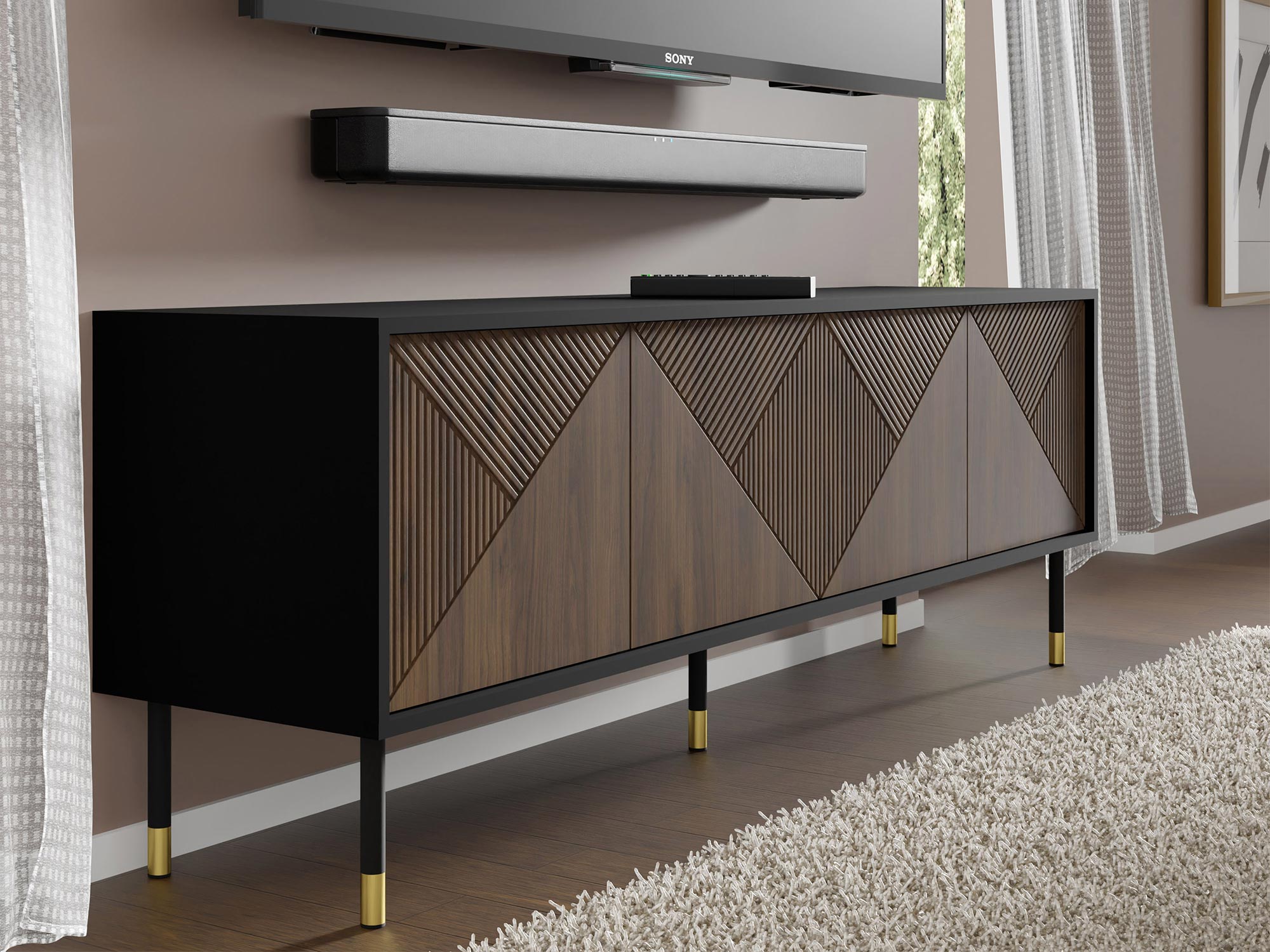 Korpus szafki RTV Cora wykonany jest z płyty laminowanej o grubości 16 mm, co gwarantuje jej trwałość i odporność na uszkodzenia. Fronty z płyty MDF o grubości 18 mm dodają całości elegancji i nowoczesnego wyglądu. Nogi o wysokości 20 cm wykonane są z metalu, co zapewnia stabilność i wytrzymałość mebla. Wykończenie w kolorze czarnym z akcentami w kolorze złotym oraz fronty w kolorze dębu catania nadają szafce wyjątkowego stylu.