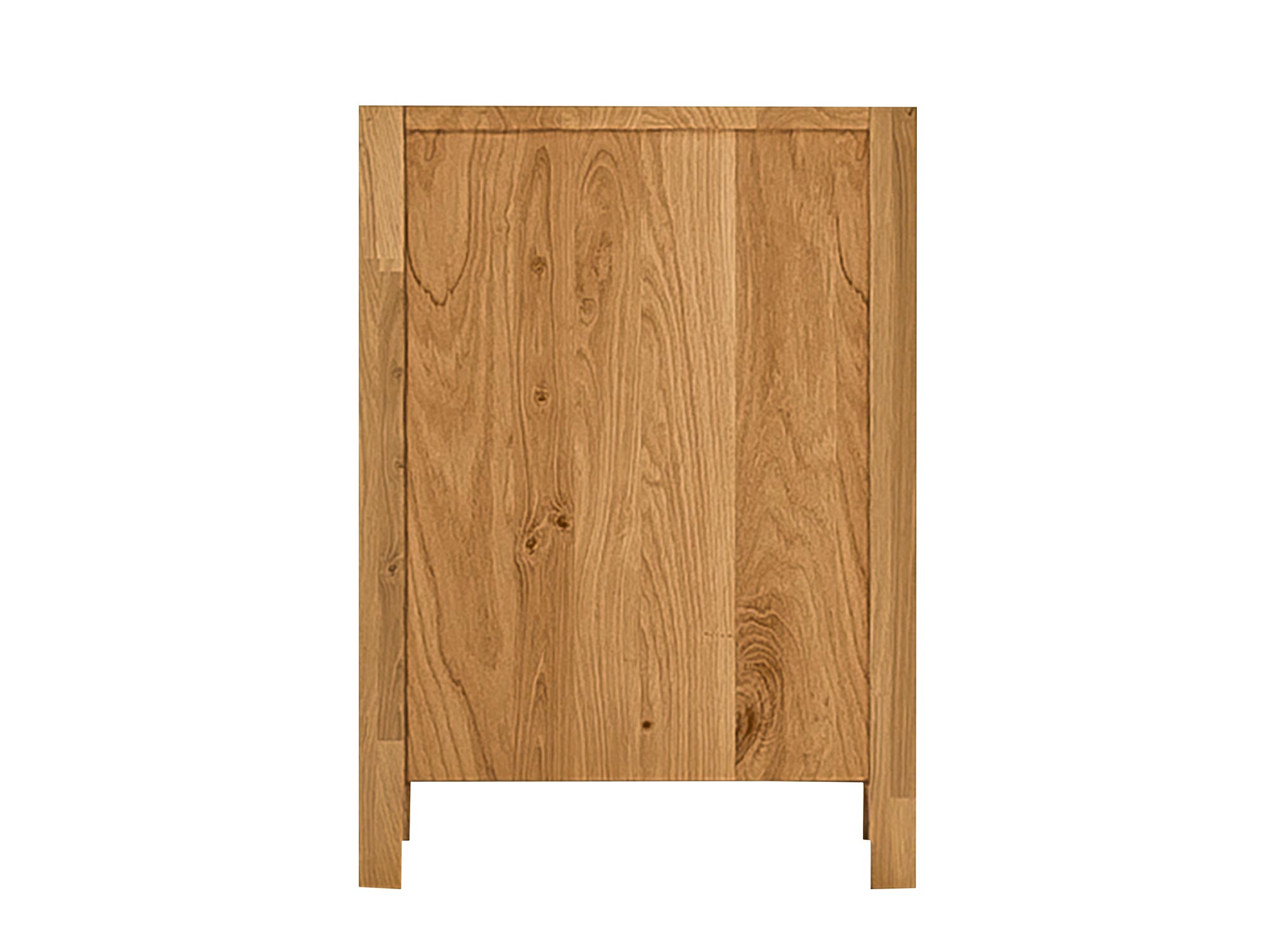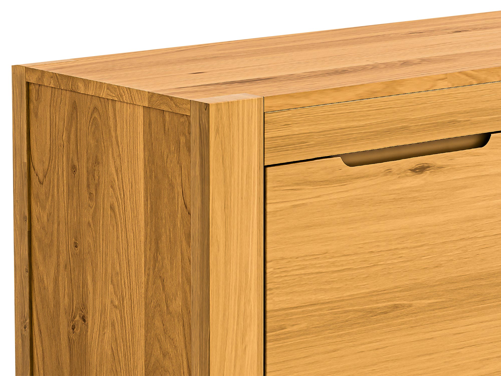 Estetyka idzie tu w parze z ergonomią. Frezowane uchwyty zastępują tradycyjne gałki, dzięki czemu bryła pozostaje czysta, a jednocześnie wygodna w obsłudze. Cichy domyk w drzwiach sprawia, że mebel zamyka się miękko i bezszelestnie — to szczególnie ważne wieczorem, kiedy dom już odpoczywa. Masywne dębowe nogi dodają smukłości, ułatwiają sprzątanie pod meblem i zapewniają stabilność nawet przy pełnym obciążeniu.