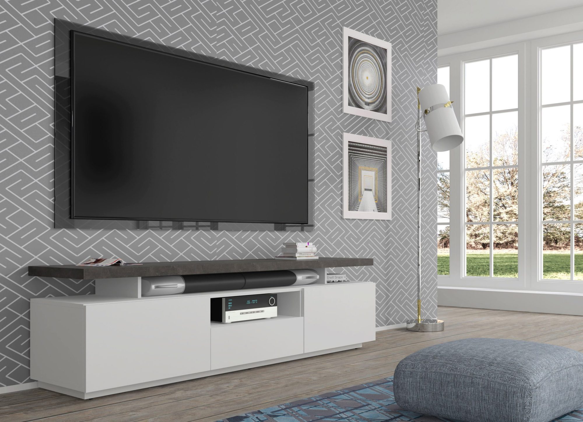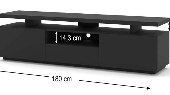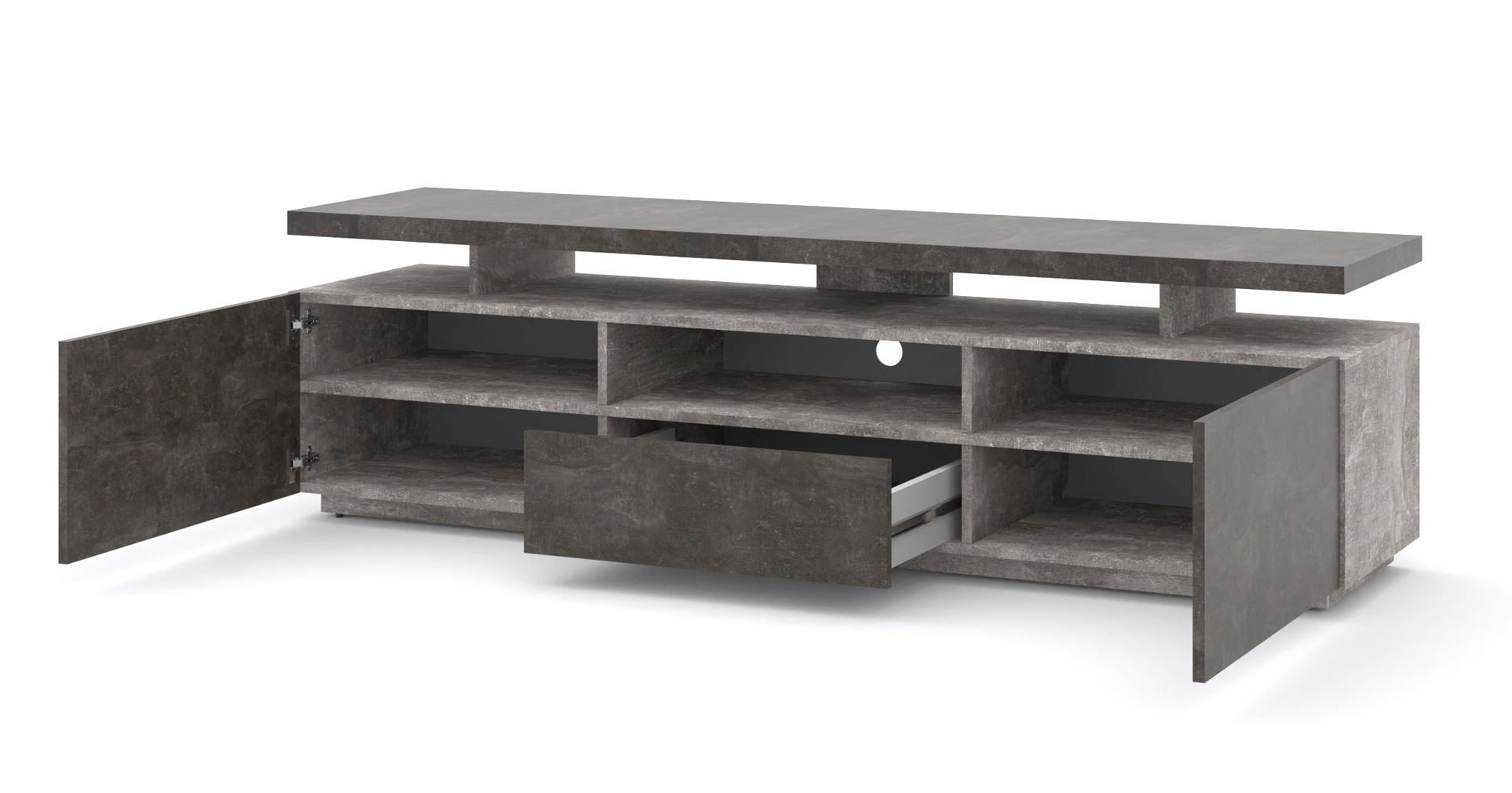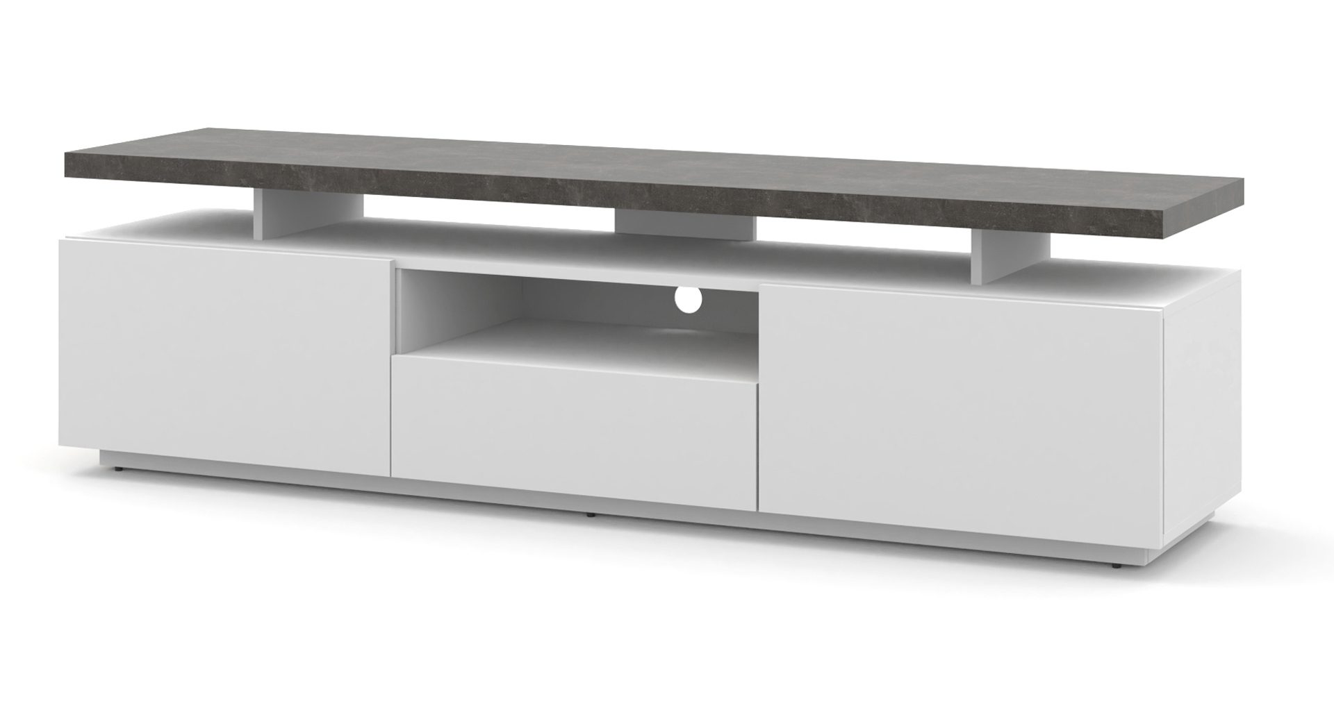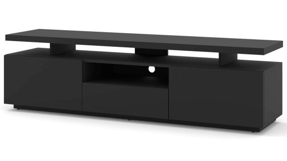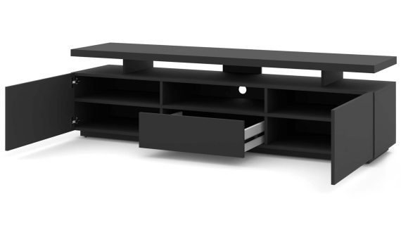 Przestronna wnęka z podwójną osłoną umożliwia ustawienie konsoli, dekodera lub soundbara – bez plątaniny kabli i chaosu na półkach. Otwór w tylnej ściance pozwala estetycznie przeprowadzić przewody, zapewniając idealny porządek. Dodatkowo dwie boczne szafki oraz centralna szuflada pomieszczą piloty, dokumenty, płyty czy inne drobiazgi – wszystko, co chcesz mieć pod ręką, ale niekoniecznie na widoku.