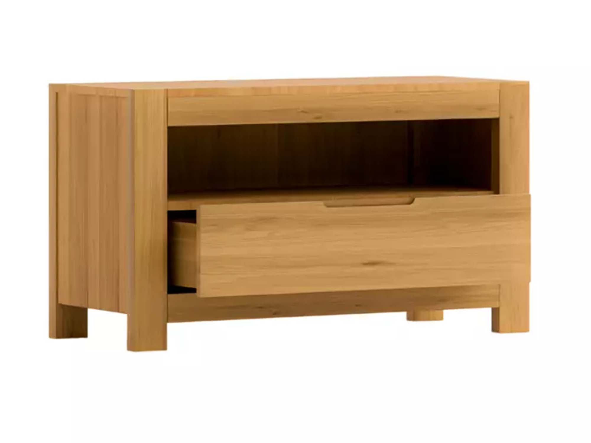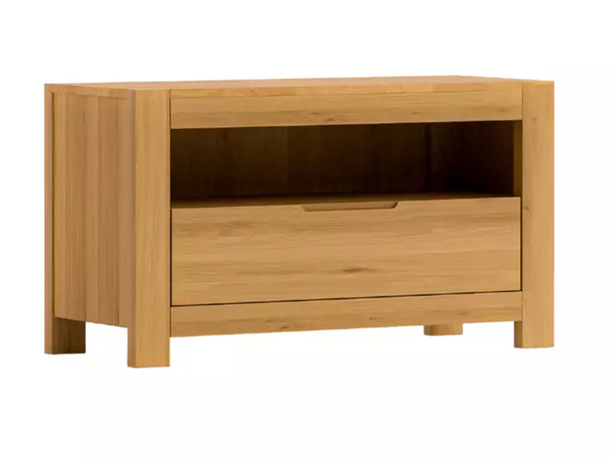 Po stronie „wnętrza” projekt jest równie dopracowany. Boki i przegrody wykończono fornirem dębowym, a środek – laminatem w kolorze dębu, odpornym na codzienne użytkowanie i łatwym w pielęgnacji. Szuflada z cichym domykiem porusza się lekko i bezszelestnie – idealna na piloty, kable, instrukcje i akcesoria. Otwarta półka zapewnia wygodny dostęp i dobrą wentylację dla elektroniki. Stabilne, dębowe nogi optycznie „odchudzają” bryłę i ułatwiają utrzymanie czystości pod meblem.