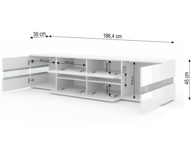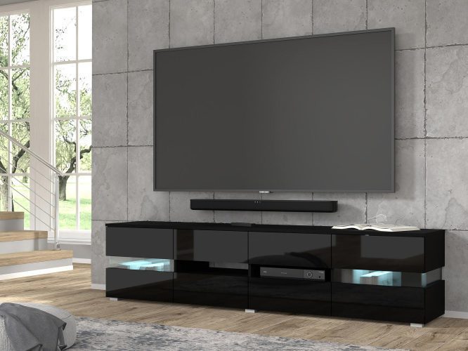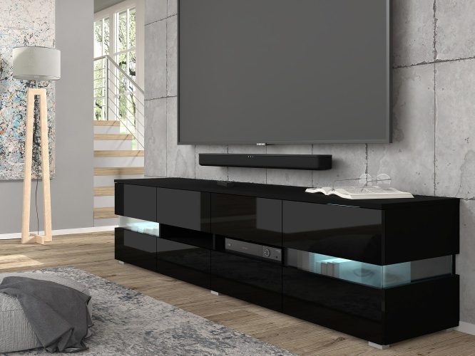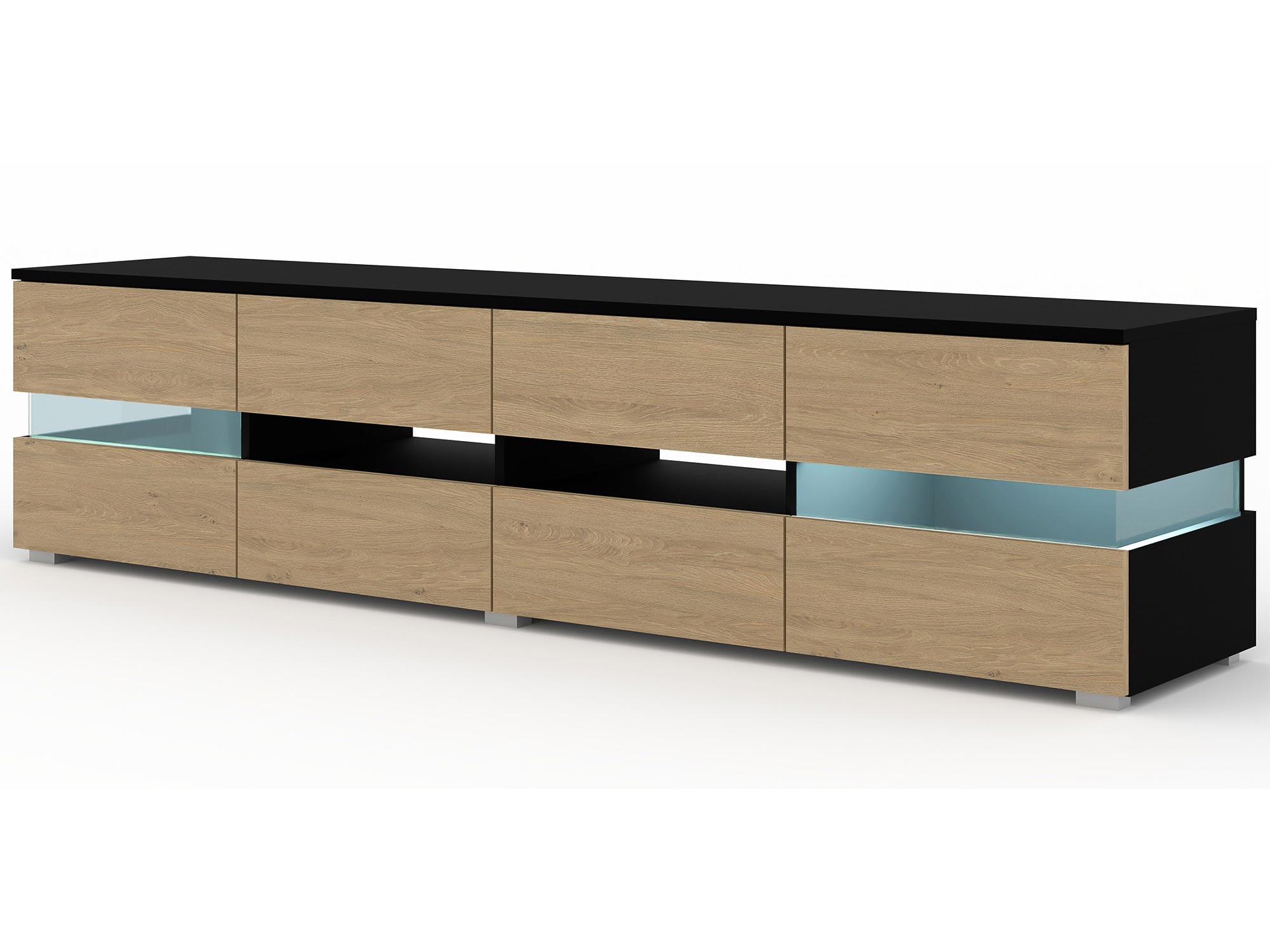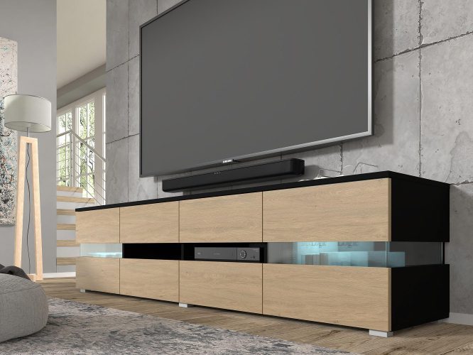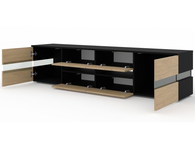 - Duża pojemność: Sześć zamykanych szafek, w tym przeszklone oraz otwarte półki, zapewniają miejsce na sprzęt RTV i akcesoria.