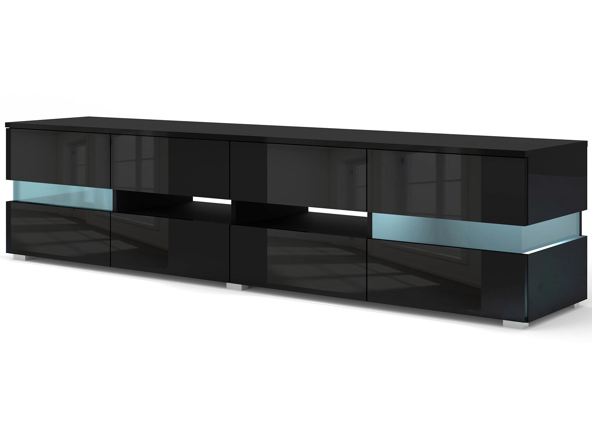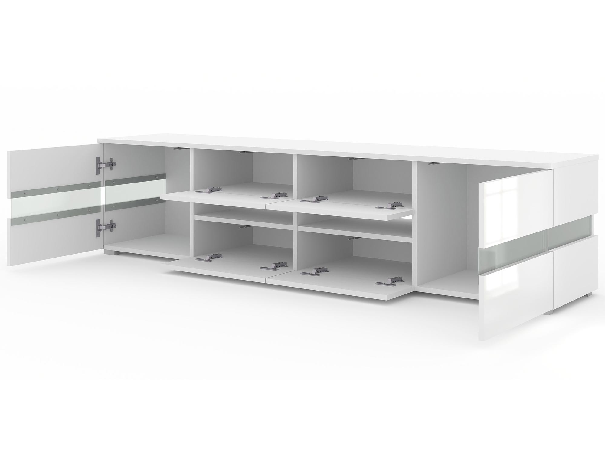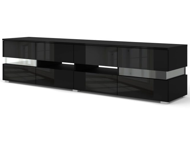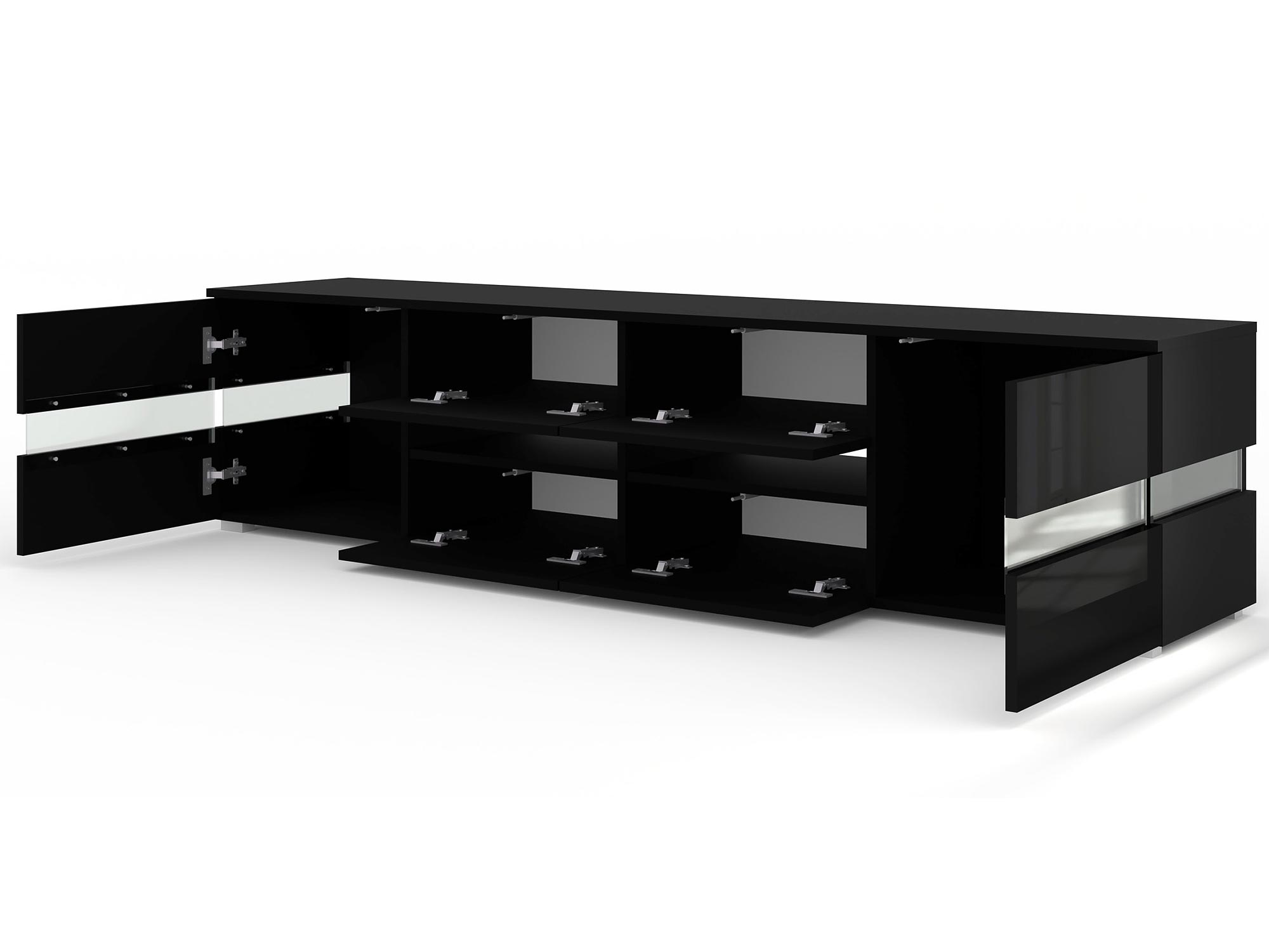 - Duża pojemność: Sześć zamykanych szafek, w tym przeszklone oraz otwarte półki, zapewniają miejsce na sprzęt RTV i akcesoria.