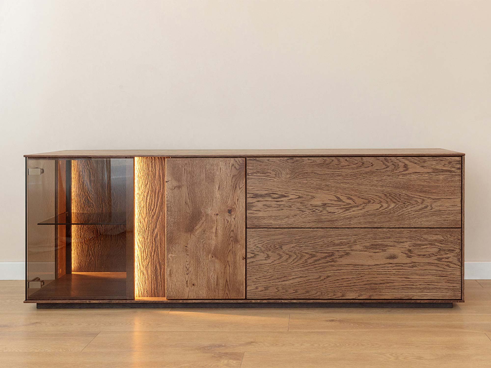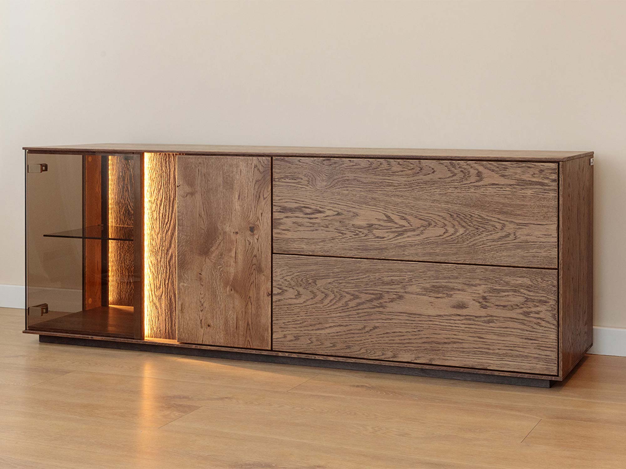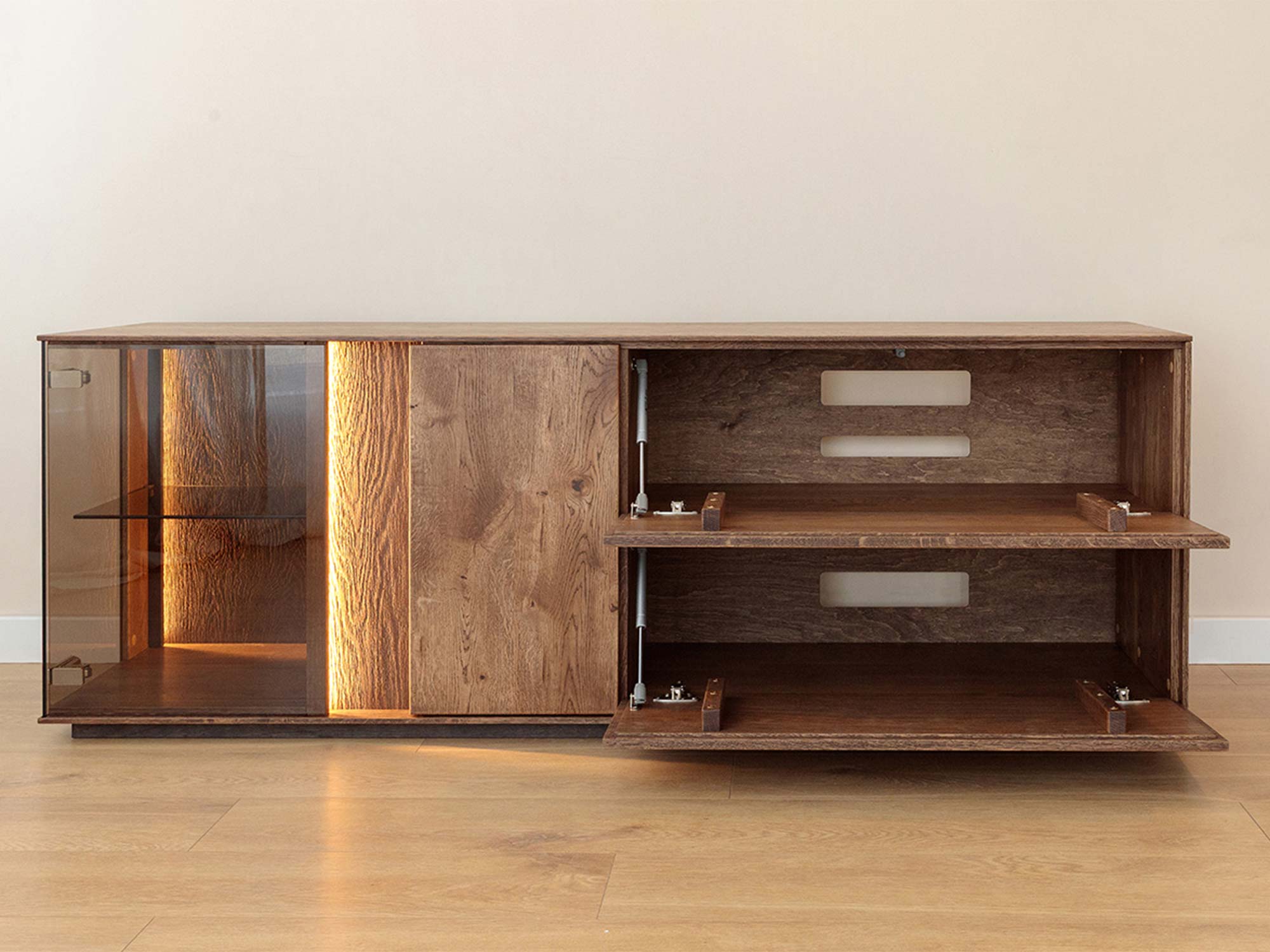 Przeszklony moduł wprowadza lekkość i elegancję. Transparentna tafla pozwala wyeksponować designerskie dodatki, płyty winylowe, kolekcję płyt DVD czy piękne akcesoria audio. Wieczorami subtelne LED nadają witrynowi nastroju – to poczucie „wow”, gdy delikatna poświata podkreśla szkło i dąb, wygaszając zbędne detale tła.