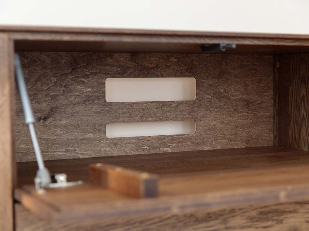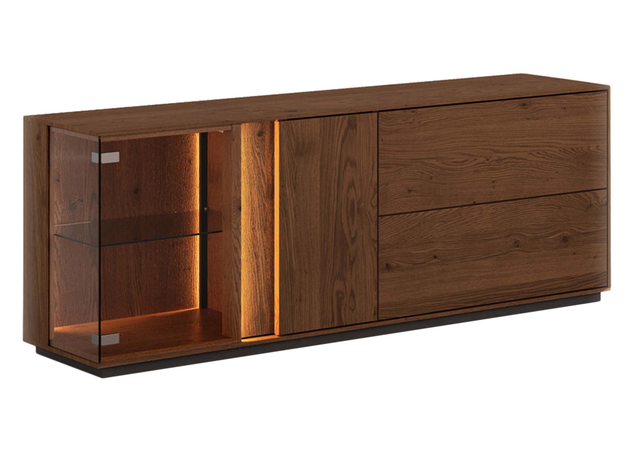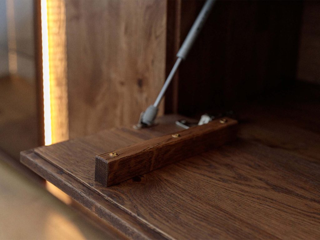 Przeszklony moduł wprowadza lekkość i elegancję. Transparentna tafla pozwala wyeksponować designerskie dodatki, płyty winylowe, kolekcję płyt DVD czy piękne akcesoria audio. Wieczorami subtelne LED nadają witrynowi nastroju – to poczucie „wow”, gdy delikatna poświata podkreśla szkło i dąb, wygaszając zbędne detale tła.