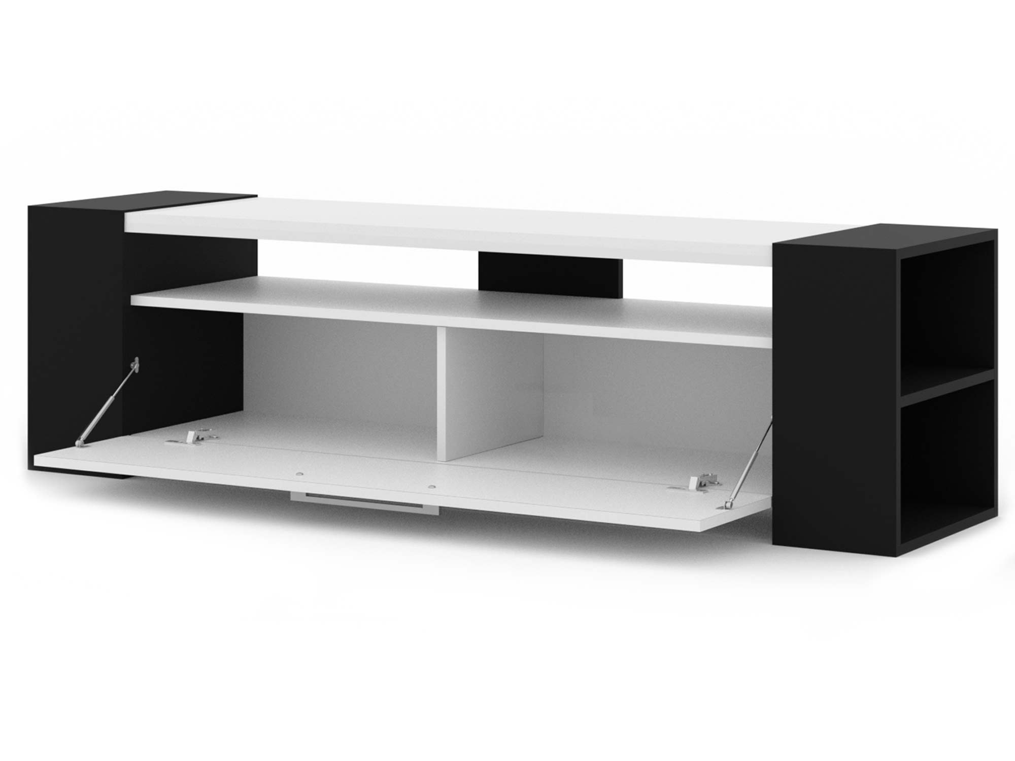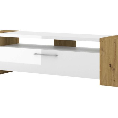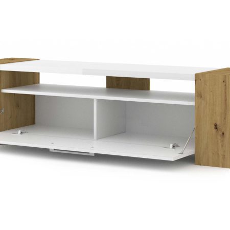Szafka RTV DARLA to esencja przemyślanego designu. Jej prostokątna forma została wzbogacona o fronty w wysokim połysku, co nie tylko pięknie odbija światło, ale też nadaje całości elegancki i lekki charakter. Trzy warianty kolorystyczne pozwalają dopasować mebel do Twojego wnętrza: od nowoczesnego zestawienia czerni i bieli, po subtelny i naturalny odcień dąb artisan, który ociepli każde pomieszczenie.