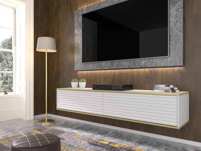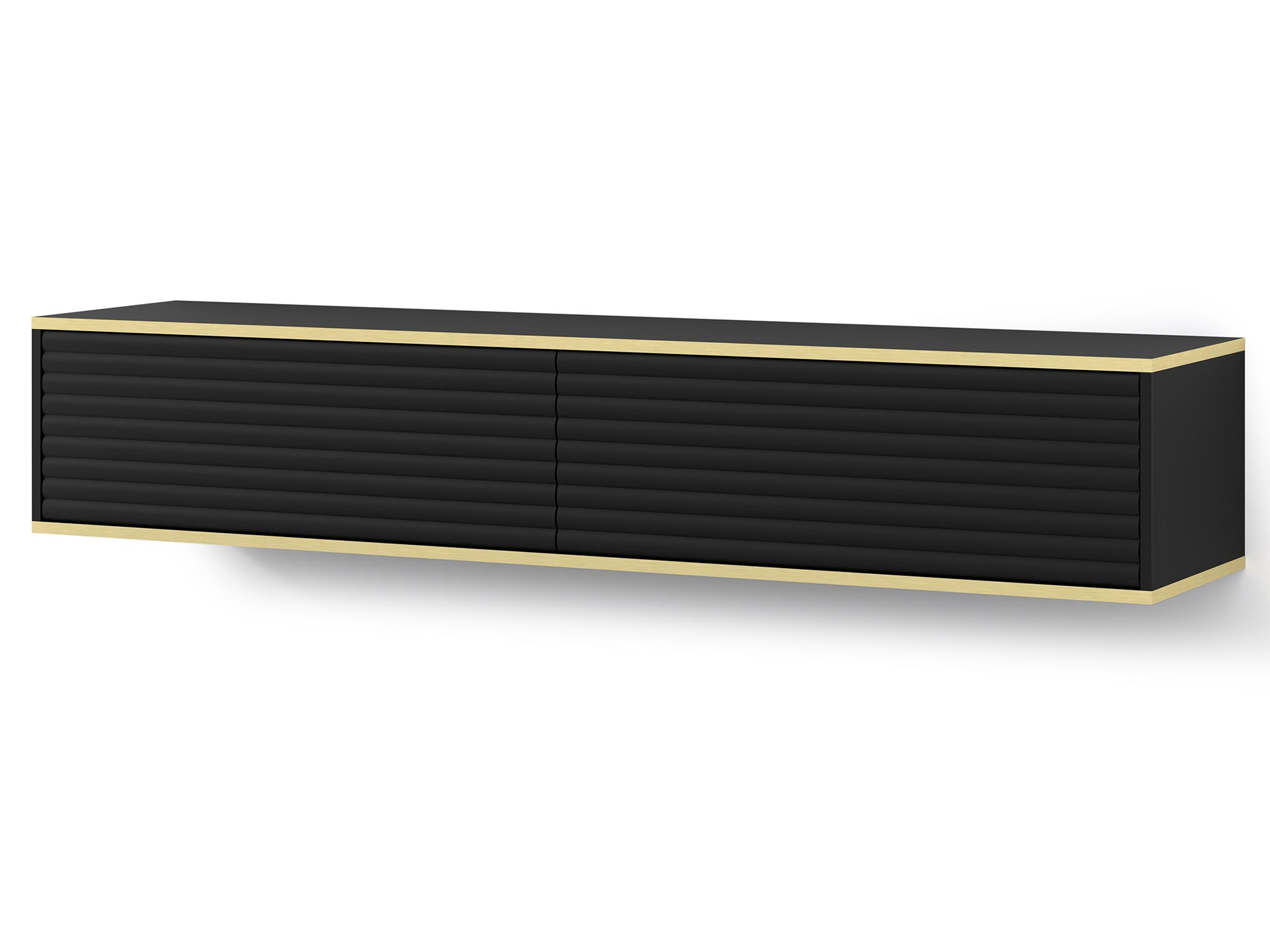 Dwudrzwiowa Szafka RTV Wisząca Verdi z Frezowanymi Frontami to idealny wybór dla osób ceniących sobie połączenie estetyki z funkcjonalnością. Ten stylowy mebel został stworzony, aby wnieść do wnętrza wyjątkowy charakter dzięki eleganckim frezowanym frontom o efekcie 3D oraz subtelnym złotym akcentom. Szafka Verdi nie tylko doskonale sprawdzi się jako praktyczny schowek na sprzęt RTV i akcesoria, ale również wprowadzi nowoczesny i luksusowy akcent do salonu, sypialni lub pokoju młodzieżowego. Możliwość zawieszenia na ścianie nadaje jej lekkości, wpisując się w najnowsze minimalistyczne trendy.