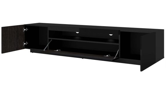 W centralnej części mebla znajduje się otwarta wnęka, idealna na dekoder, konsolę do gier czy soundbar. Dzięki otworowi na przewody w tylnej ściance, kable pozostają ukryte, a cała aranżacja wygląda schludnie i harmonijnie. Po bokach znajdziesz zamknięte półki, które świetnie sprawdzą się do przechowywania płyt, dokumentów, pilotów i innych akcesoriów RTV.