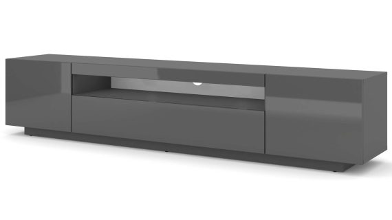 Szafka RTV KISMET o szerokości aż 200 cm została zaprojektowana tak, by spełniać oczekiwania najbardziej wymagających użytkowników. Jej symetryczny, prosty kształt wpisuje się w aktualne trendy minimalistycznego designu. Matowe fronty bez uchwytów sprawiają, że całość wygląda nowocześnie i czysto.