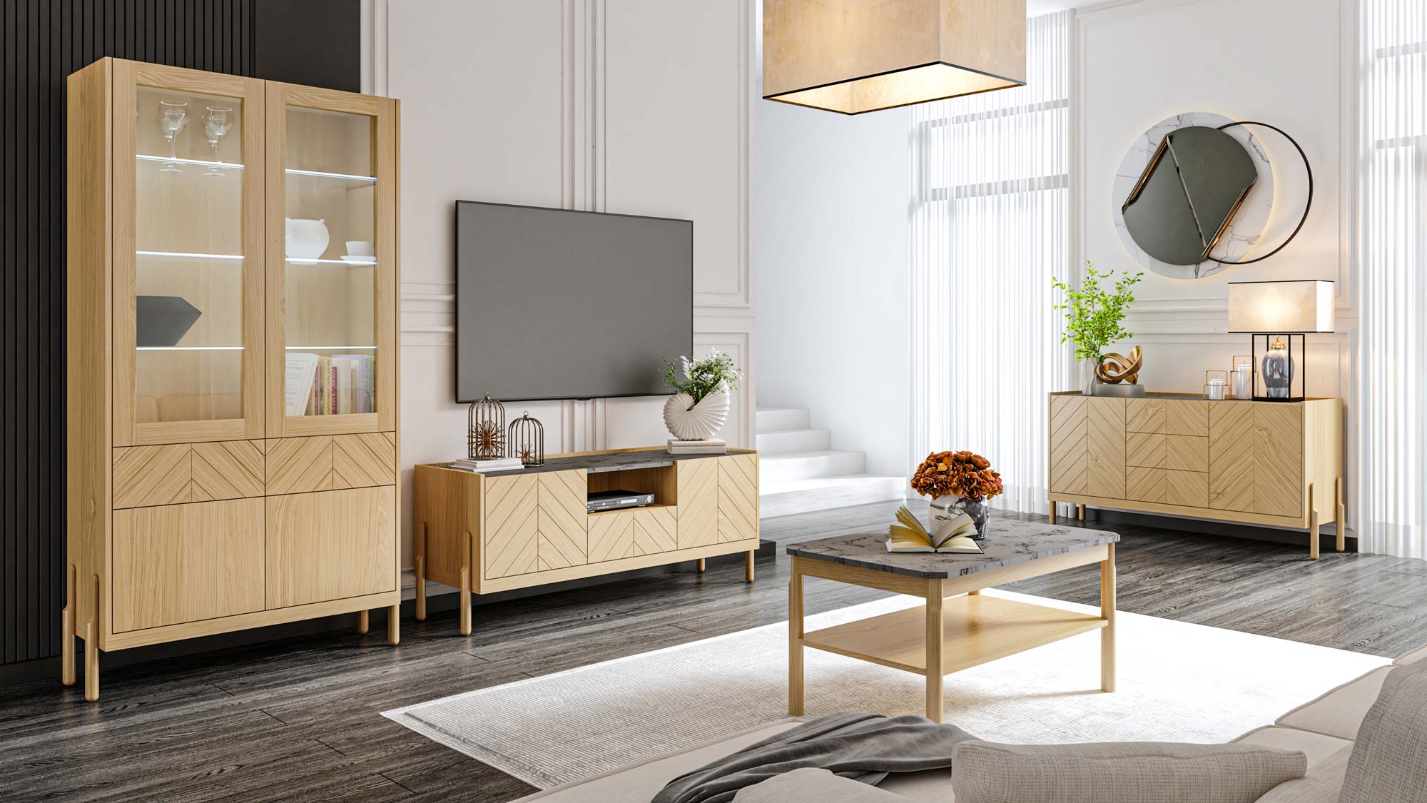 - Naturalne materiały – fornir dębowy w dwóch szlachetnych kolorach.