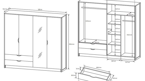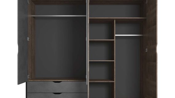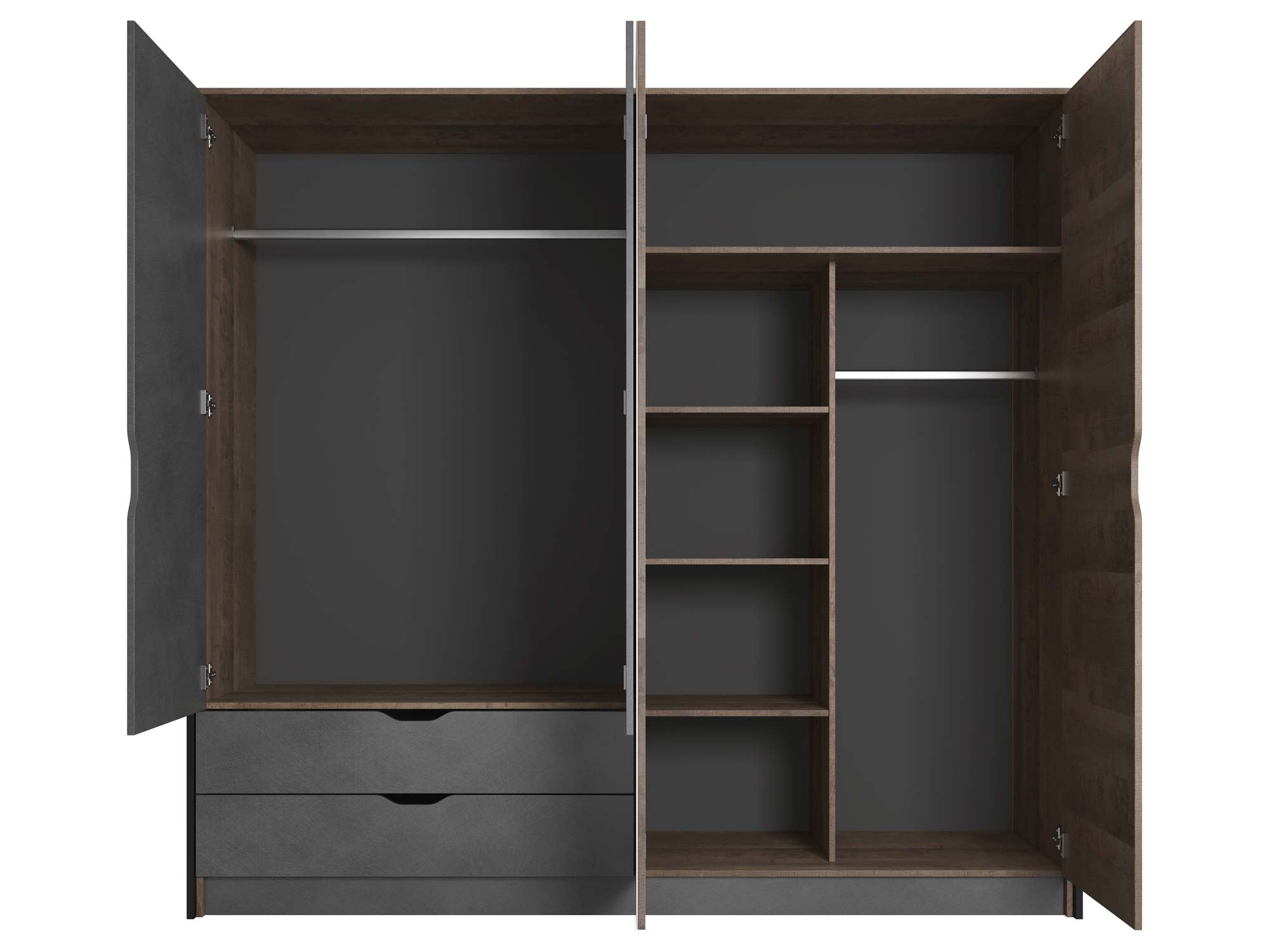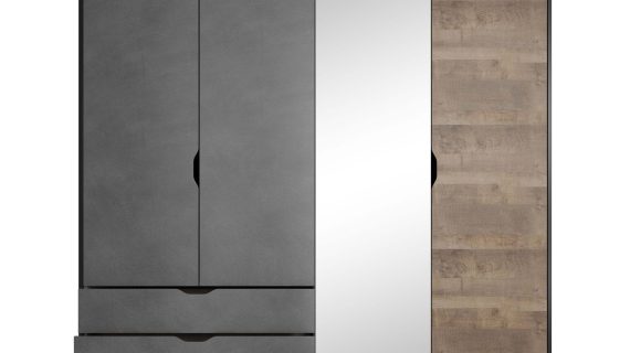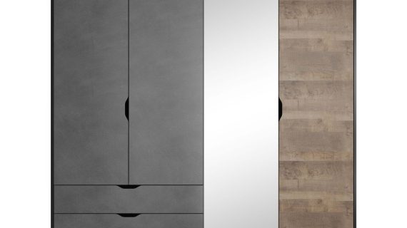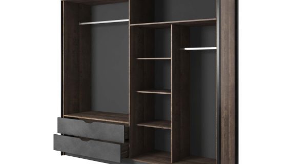 • Przemyślana konstrukcja: Przestronne wnętrze szafy obejmuje liczne szuflady, półki oraz lustro, co umożliwia skuteczną organizację przestrzeni.