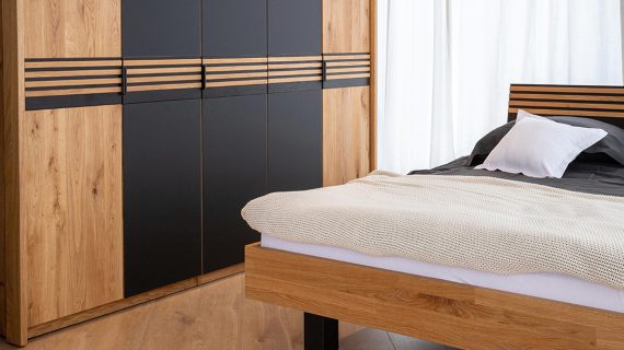 Inari jest bazą, która „niesie” aranżację: z miękką pościelą, lnianymi zasłonami i złotymi akcentami stworzy ciepły, kobiecy klimat; z surowym betonem, grafitami i czarnymi dodatkami – elegancki, męski porządek. Ta szafa nie narzuca się, tylko podkreśla Twój styl.