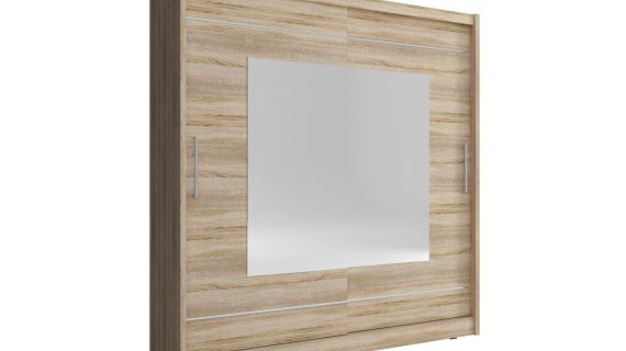 Szafa ubraniowa z lustrzanymi wstawkami FEBUS IX 180cm jest bardzo pakownym, zarazem ciekawie wyglądającym meblem. Co więcej w jej środku znajdują się dwie duże półki umieszczone na samej górze, poniżej podzielona została ona na dwie części z czego jedna przeznaczona na ubrania wiszące na drążku, a druga posiada półki. Dodatkowo na drzwiach umieszczone jest duże lustro. Ponadto szafa pomoże odpowiednio zagospodarować przestrzeń i zachować porządek wśród elementów garderoby.
