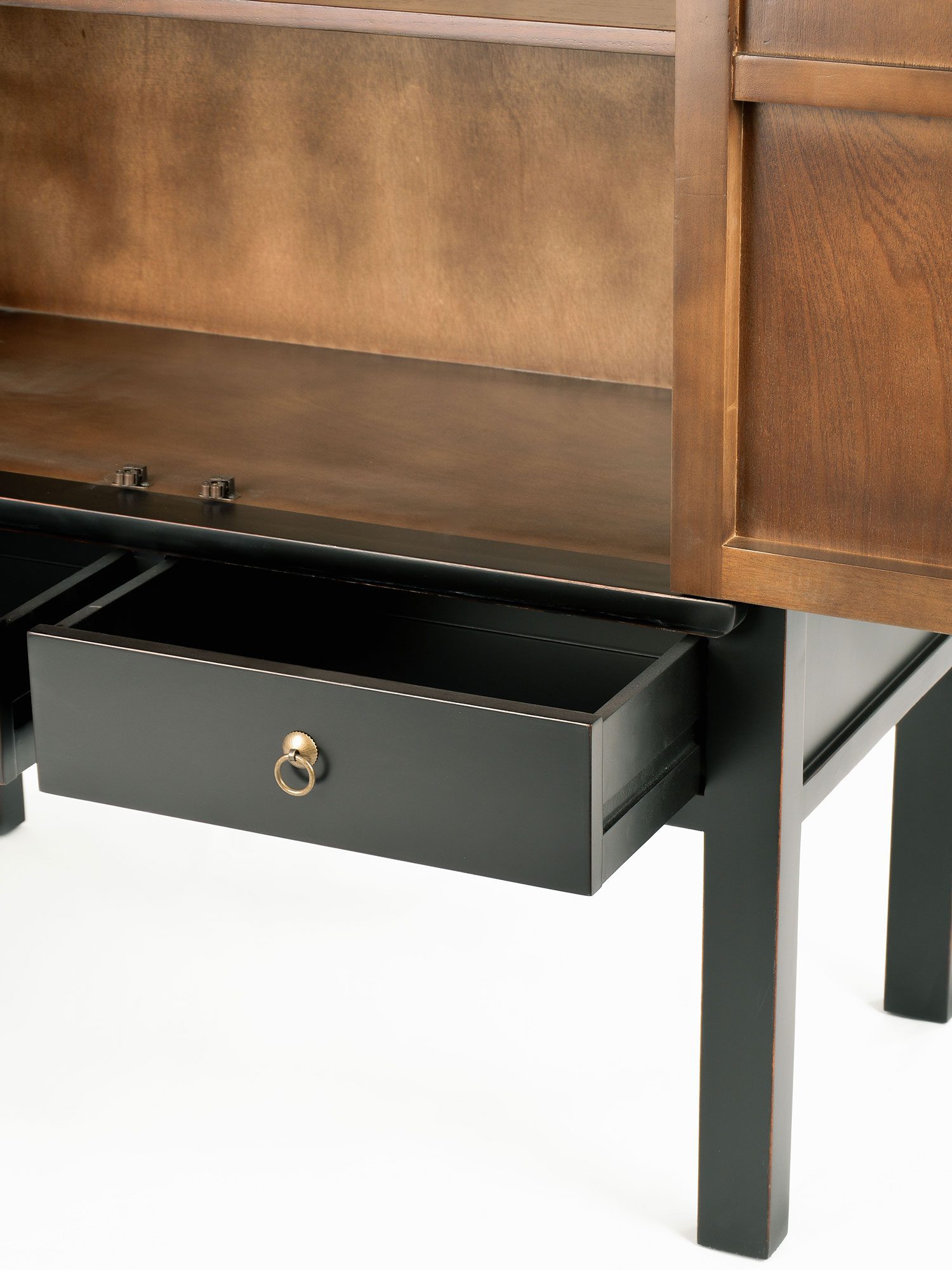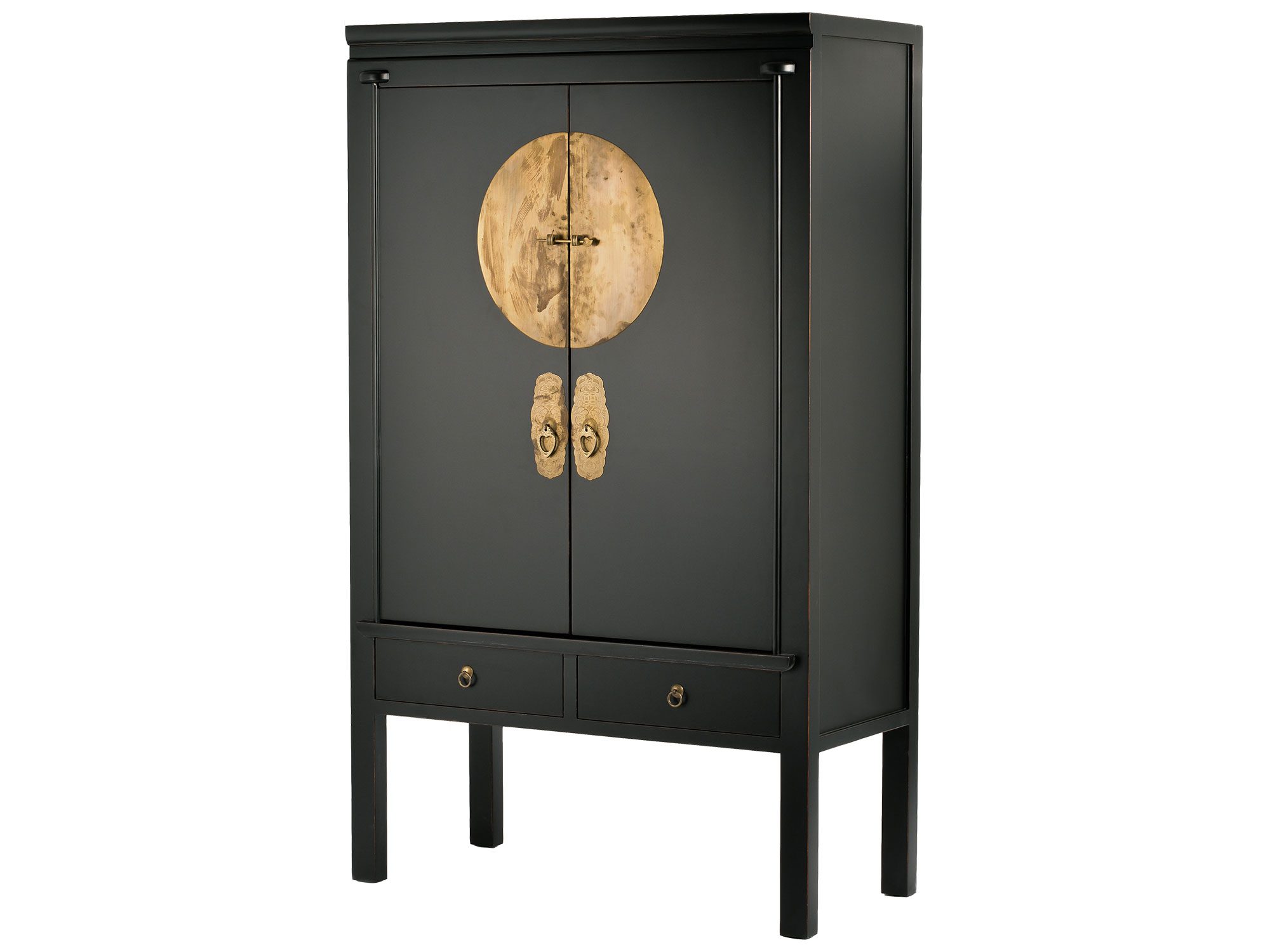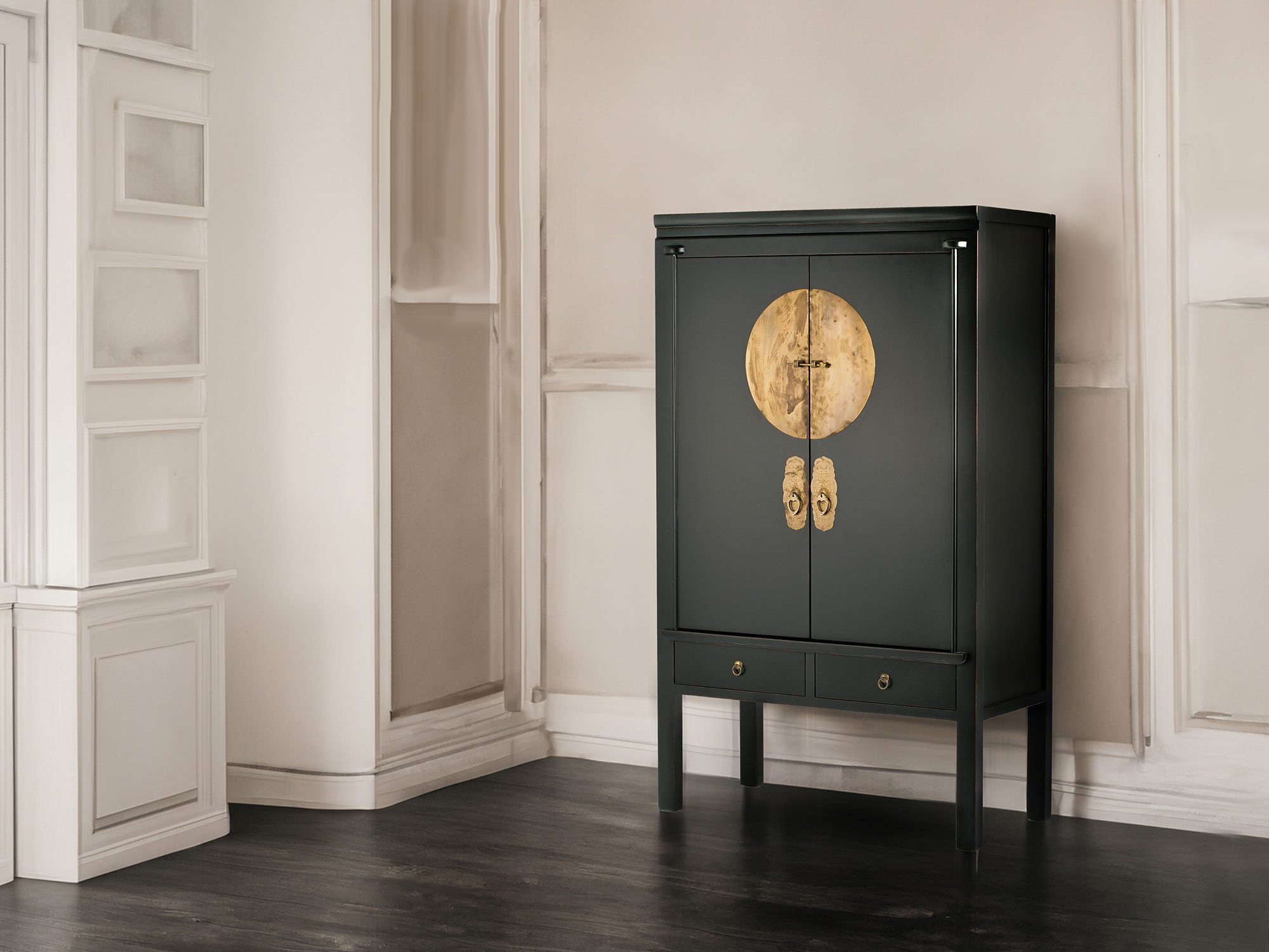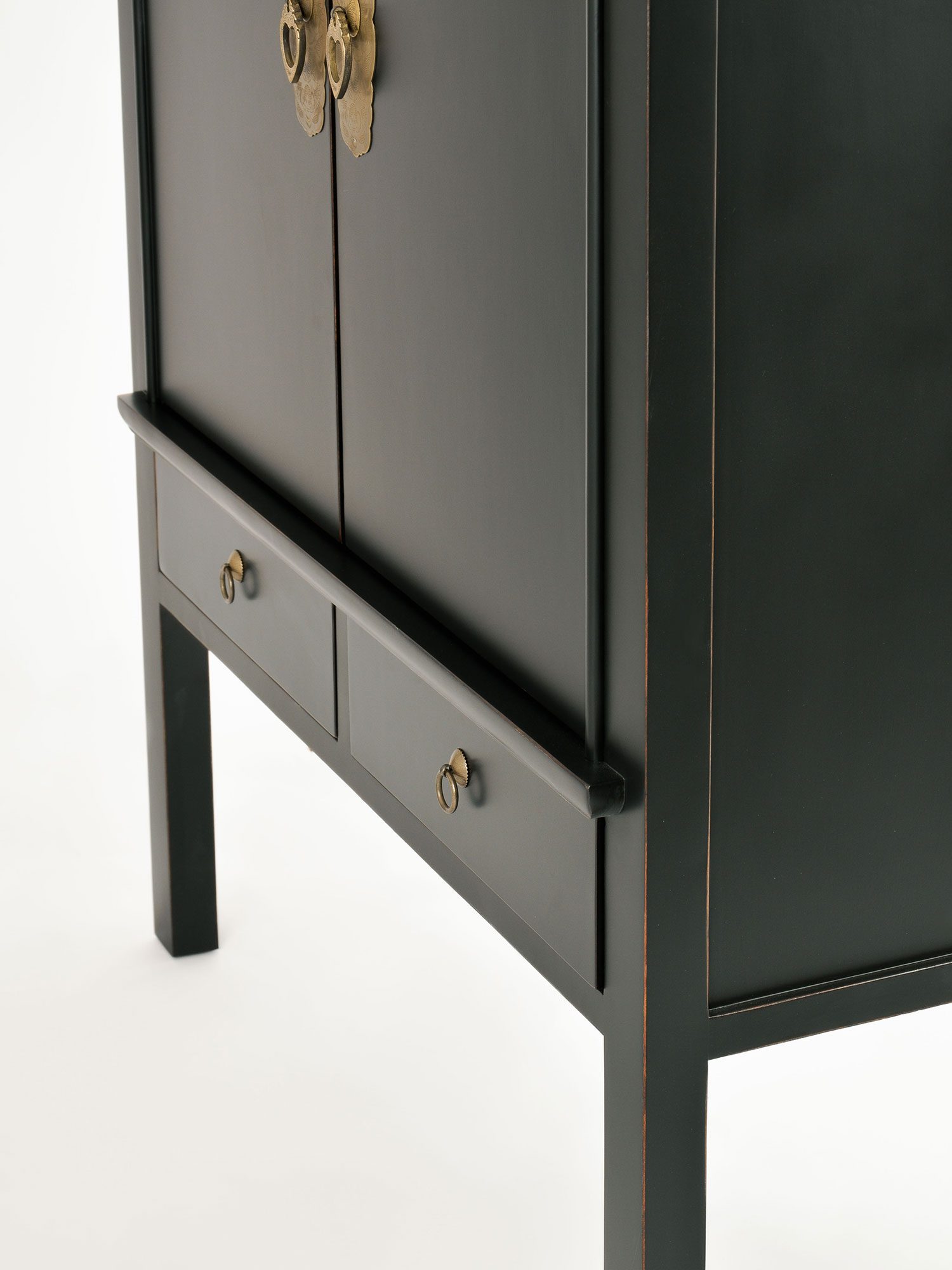 Elegancka szafa o unikalnym charakterze, która zachwyca połączeniem klasyki z orientalnymi detalami. Wykonana z drewna wiązu, z czarnym wykończeniem i subtelnymi czerwonymi przetarciami. Wyposażona w złote okucia oraz ozdobne uchwyty i koła w stylu orientalnym, stanowi doskonałe uzupełnienie stylowego wnętrza.