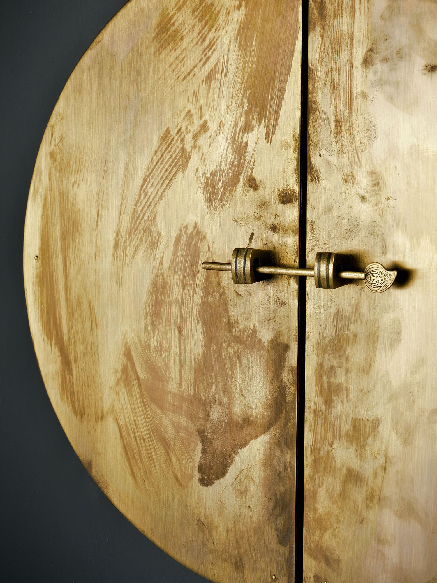 Ta wyjątkowa szafa łączy w sobie klasyczne linie z egzotycznym, orientalnym wzornictwem. Zdobione fronty z delikatnymi przetarciami i charakterystyczne metalowe elementy w kolorze mosiądzu nadają jej niepowtarzalnego charakteru. Solidne wykonanie z drewna wiązu oraz perfekcyjne wykończenie sprawiają, że szafa jest nie tylko funkcjonalna, ale i przyciągająca uwagę.