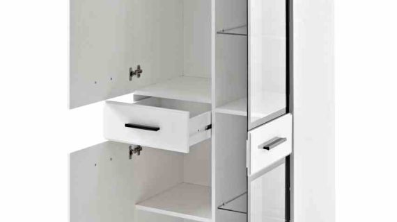 Demonstrowana obok witryna Noah to wyjątkowa seria, która doda każdemu wnętrzu eleganckiego stylu i wyjątkowej estetyki. Co więcej komponenty najwyższej klasy zostały wykorzystane do wykonania mebla – są to płyty laminowane w korpusie, płyty MDF na frontach oraz dodatkowo hartowane i szlifowane szkło, cechujące się wytrzymałością i solidnością. Witrynę ponadto zabezpieczono obrzeżem ABS dlatego jest ona odporna na zniszczenia i uszkodzenia mechaniczne, oraz wzmacnia trwałość i zabezpiecza przed wilgocią, a przy tym jest ono odporne na ścieranie. Witryna jest złożona z 3 pojemnych szafek z kilkoma półkami i małej szuflady.