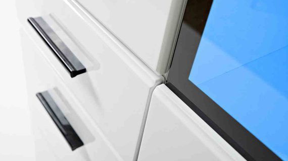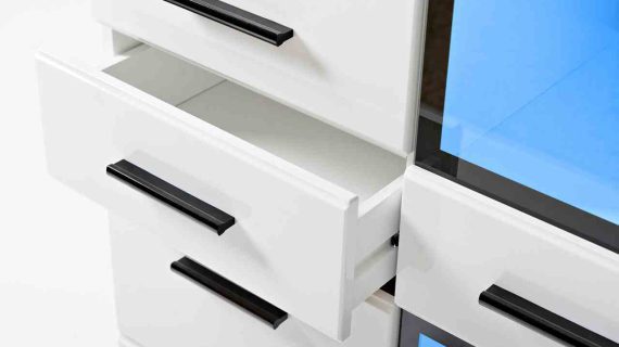 Wyjątkowa nowoczesna witryna, w kolorze bieli z przedszkolnymi frontami i oświetleniem LED nada każdemu wnętrzu świeżości i stylu. Dodatkowo czarne uchwyty dodają wnętrzu niepowtarzalnego charakteru.