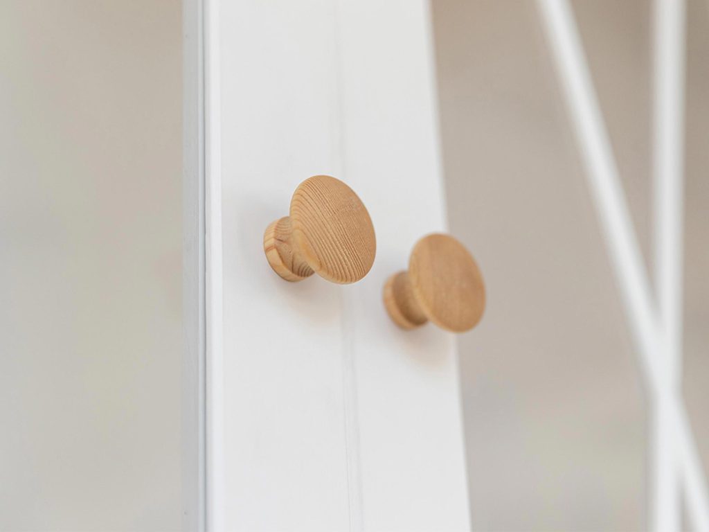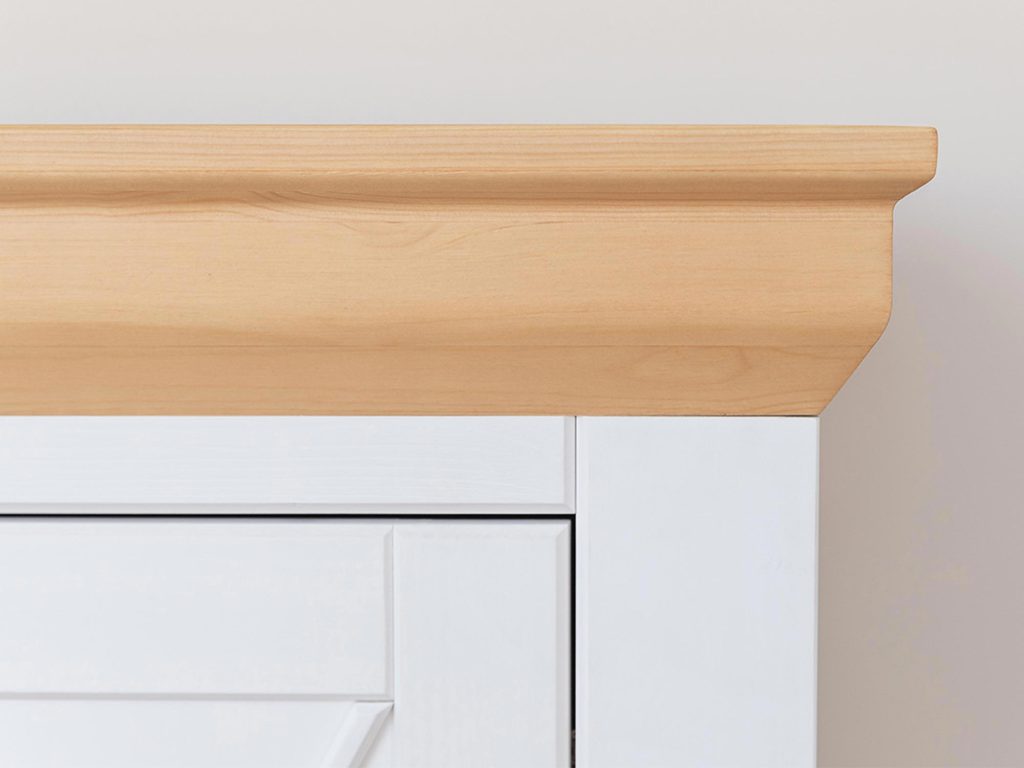 Serce tego mebla stanowi sosna fińska – drewno cenione za stabilność i trwałość. Jej naturalny rysunek, widoczny pod delikatną warstwą farby, dodaje wnętrzu miękkości i domowego ciepła. Całość wykończono farbą wodną w odcieniu ciepłej bieli (RAL 9003, krycie ok. 85%), dzięki czemu witryna harmonijnie rozprasza światło i dobrze „dogaduje się” zarówno z jasnymi, jak i ciemniejszymi ścianami.