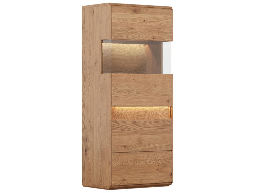 Dąb naturalny, wykończony ekologicznym olejem, zachwyca złocistym odcieniem i wyraźnym usłojeniem. Przeszklone fronty chronią zawartość przed kurzem, a opcjonalne oświetlenie LED (w zestawie) wydobywa głębię porcelany i szkła. Smukła, niższa bryła świetnie sprawdza się w mniejszych i średnich wnętrzach: salonie, jadalni, domowym biurze czy korytarzu, gdzie liczy się każdy centymetr.