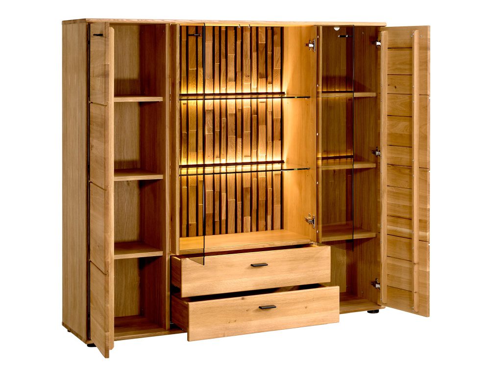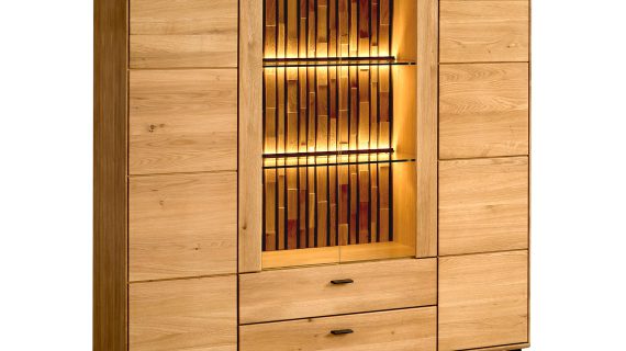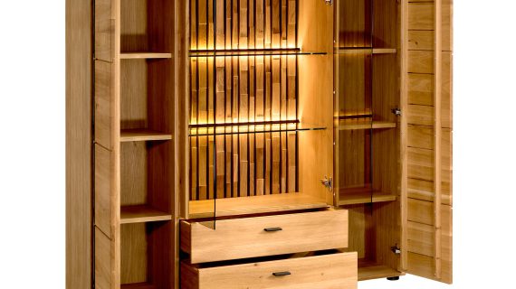 Witryna z Lamelami Prego doskonale komponuje się z różnymi stylami wnętrz. Czy to klasyczne, nowoczesne, czy skandynawskie aranżacje – wszędzie znajdzie swoje miejsce, dodając charakteru i elegancji. Naturalny kolor dębu oraz ciepłe oświetlenie sprawiają, że witryna staje się centralnym punktem pomieszczenia, przyciągając wzrok i tworząc przytulną atmosferę.