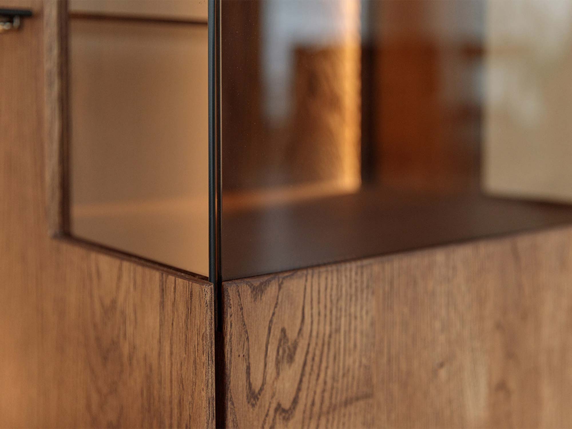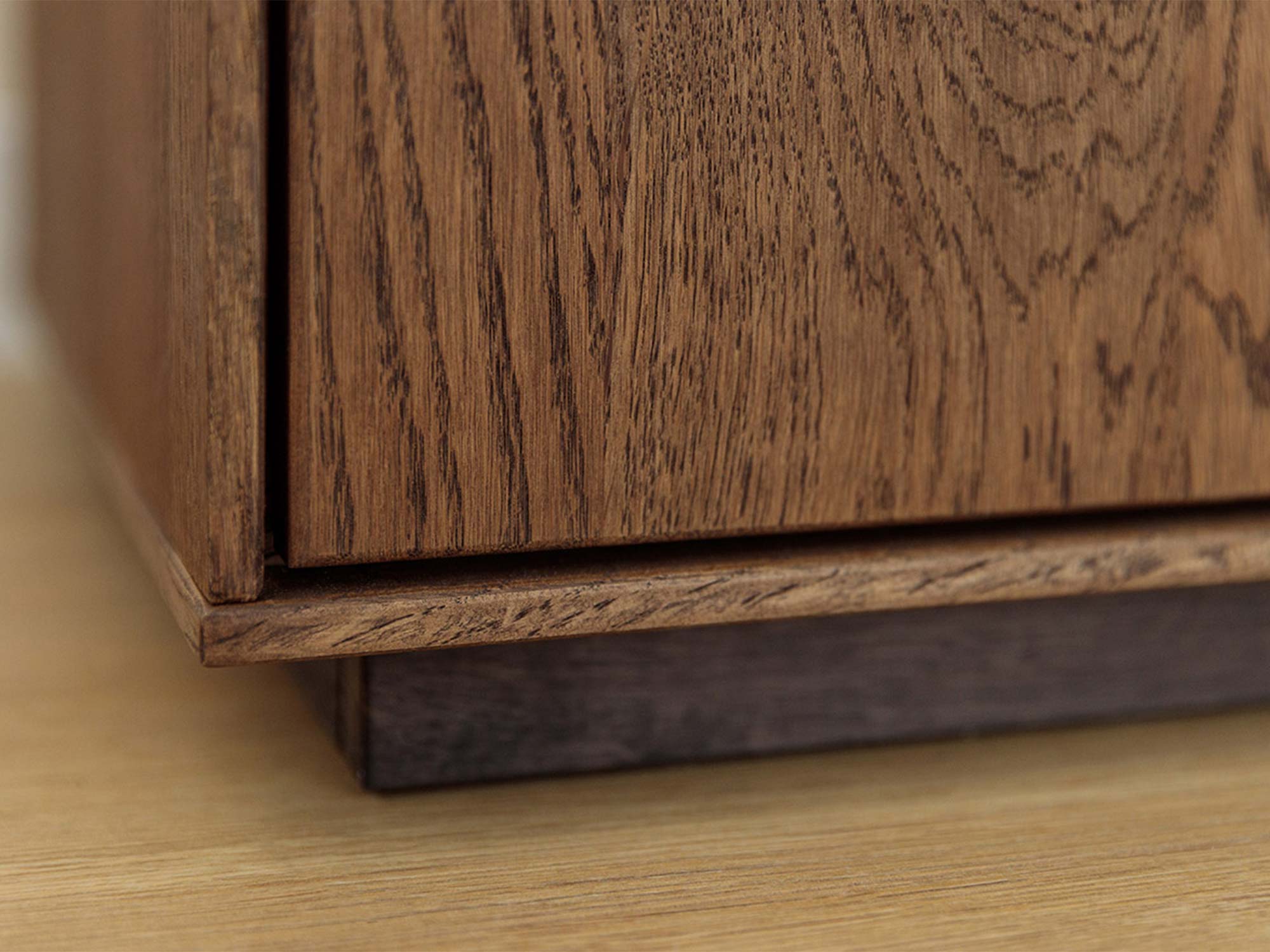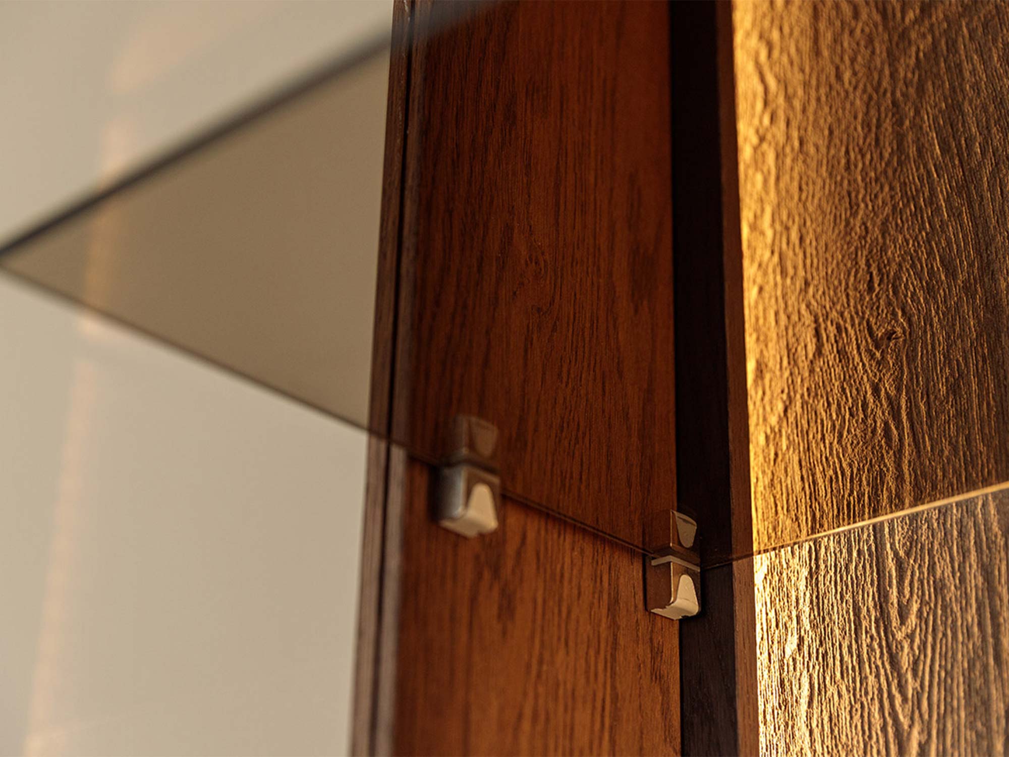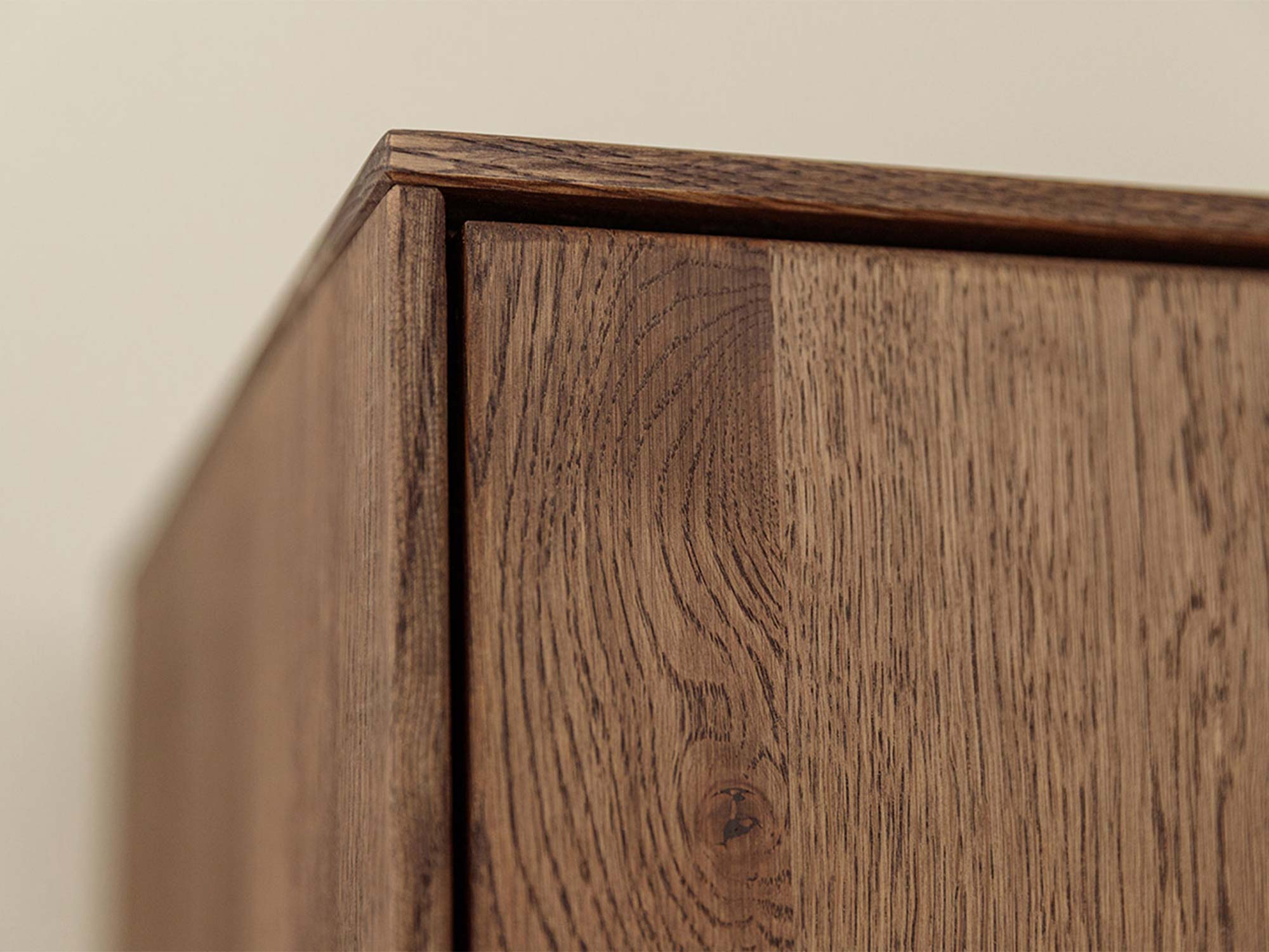 W kolekcji Essentia najważniejszy jest materiał. Lity dziki dąb zachwyca autentycznością: każdy słój i sęk tworzy niepowtarzalny rysunek, który pięknie wygląda zarówno w świetle dziennym, jak i wieczornej poświacie. Olejowane wykończenie wydobywa głębię koloru tabacco, nadaje drewnu aksamitny dotyk i stanowi naturalną warstwę ochronną w codziennym użytkowaniu. To rozwiązanie cenione w projektach premium: dyskretne, trwałe, szlachetne.