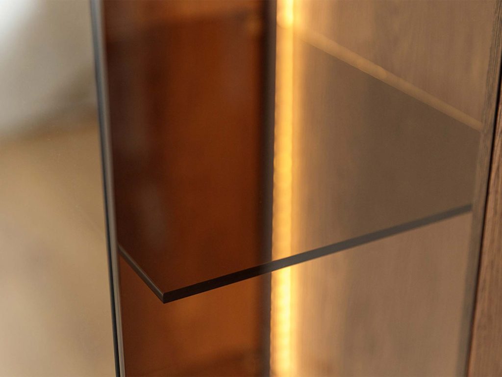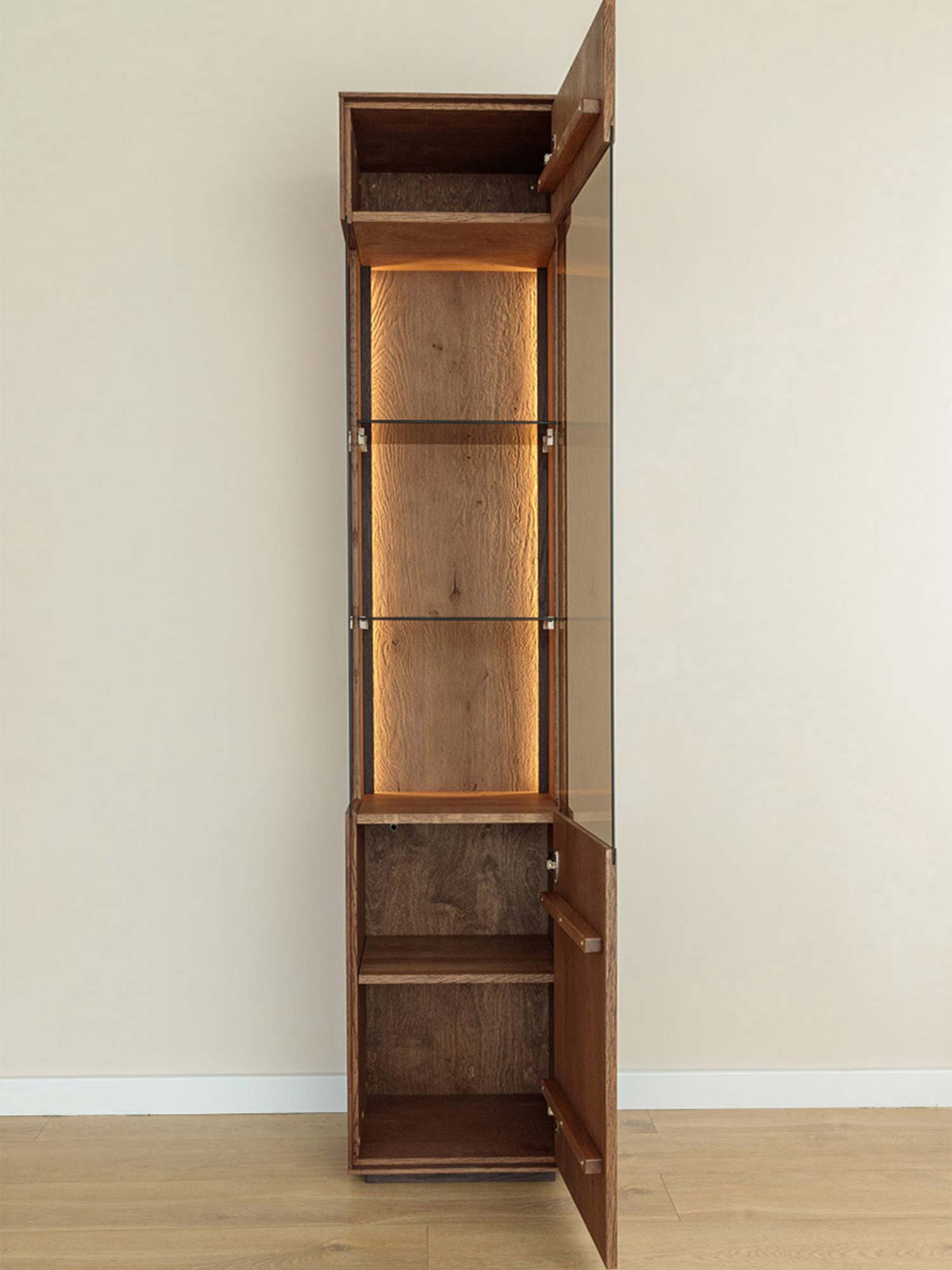 Smukła bryła (szerokość 43 cm, wysokość 205 cm, głębokość 37 cm) doskonale odnajdzie się w aranżacjach industrialnych, nowoczesnych i eklektycznych. Drobiazgowo dopracowane krawędzie i bezuchwytowe fronty z tip-onem wprowadzają wizualny porządek i lekkość. Oświetlenie LED (w zestawie) zamienia przeszkloną część w scenę dla dekoracji: porcelany, szkła, książek czy pamiątek z podróży. Po zmroku witryna staje się subtelnym źródłem nastrojowego światła — idealnym tłem dla relaksu.