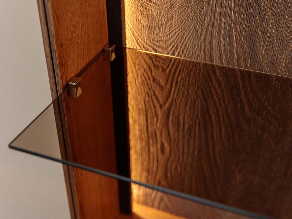 Wnętrze to przemyślana organizacja: pięć półek pozwala logicznie rozmieścić ekspozycję, a dolna zamykana strefa przechowa mniej reprezentacyjne drobiazgi. Efekt? Mniej chaosu, więcej stylu. Do tego solidna konstrukcja dębowa, która zapewnia stabilność przez lata — to mebel, po którym od razu widać jakość, a jeszcze lepiej czuć ją w codziennym użytkowaniu.