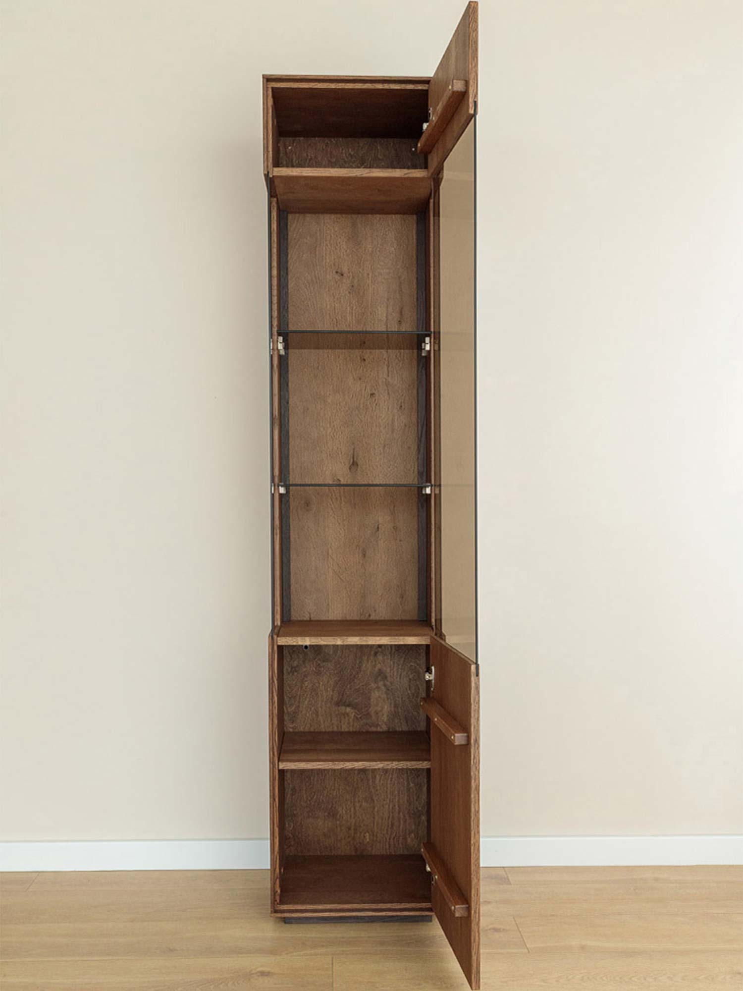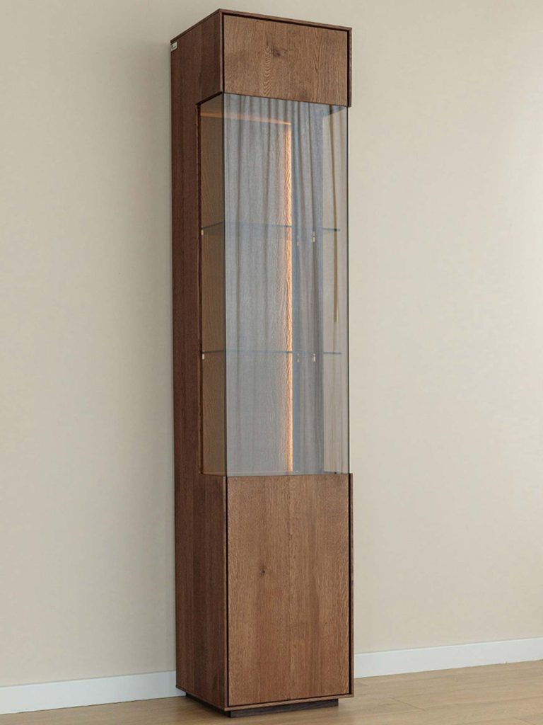 Industrialna witryna 1-drzwiowa drewniana Essentia to esencja prostoty i jakości: lity dziki dąb, ponadczasowe wykończenie olejem, subtelne szkło i światło, które wydobywa detale. Wąska, wysoka i lekka wizualnie, porządkuje przestrzeń i dodaje jej charakteru. Jeśli szukasz mebla, który łączy funkcjonalność z minimalistyczną elegancją — to wybór, który będzie cieszył przez lata.