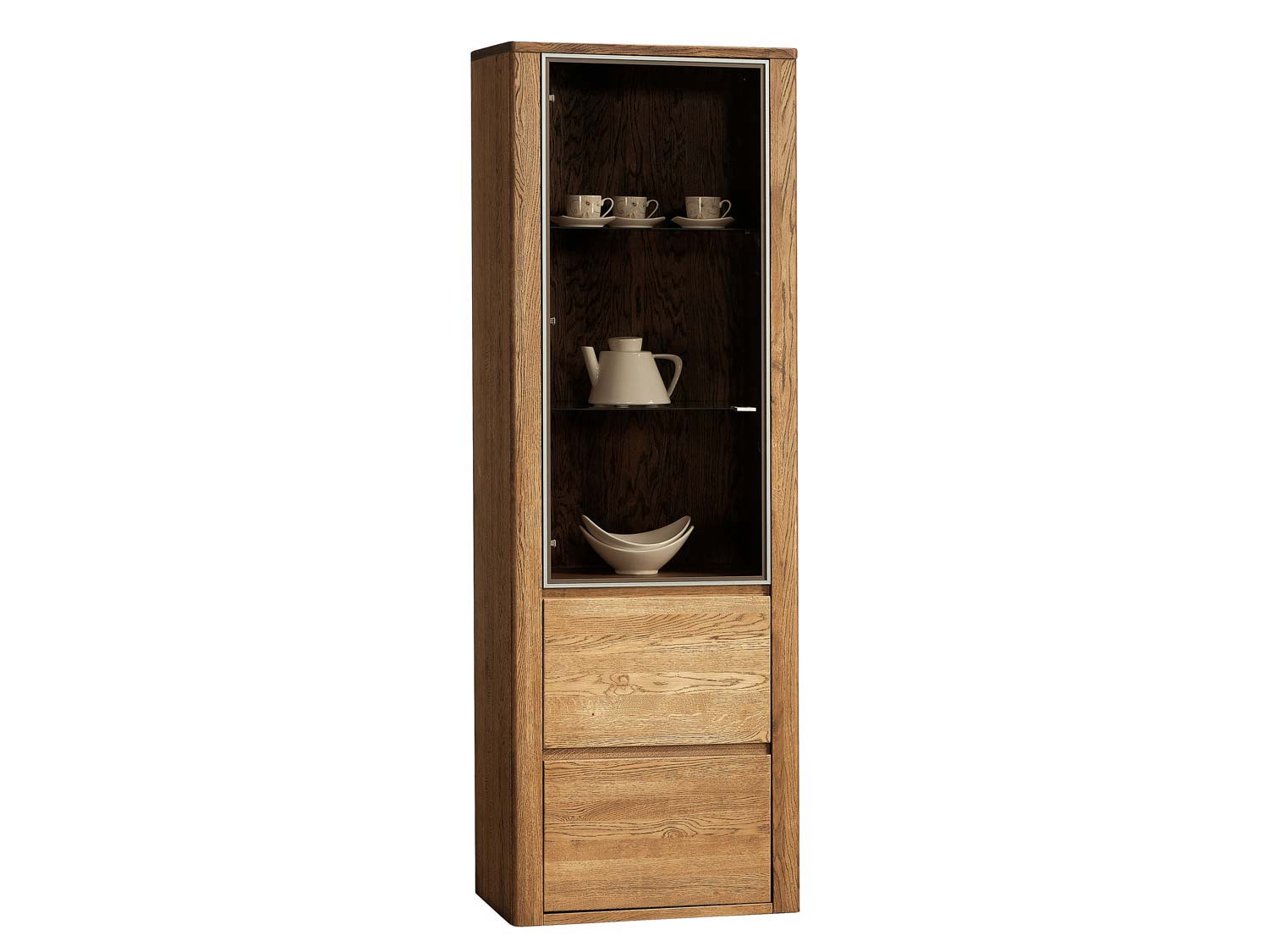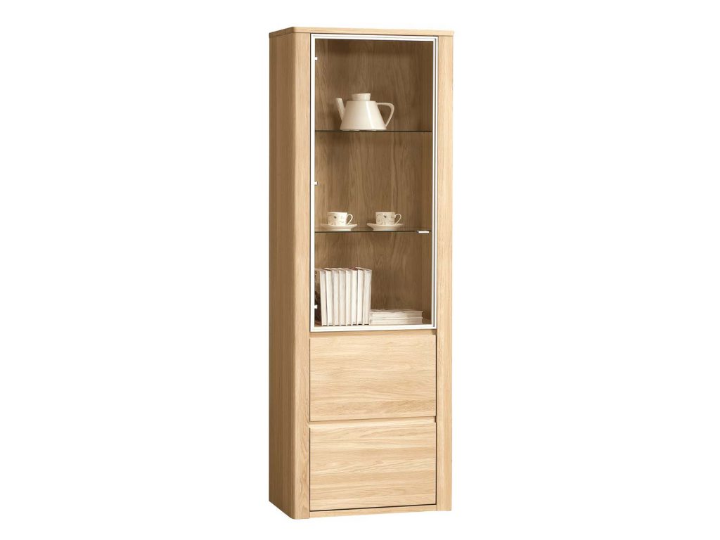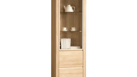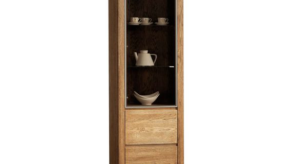 Stylowy i nowoczesny słupek do salonu Pekin zrobiony z litego drewna dębowego najlepszego gatunku z fornirowanymi detalami świetnie dostosuje się do każdej aranżacji jadalni, salonu czy pokoju dziennego. Co więcej stateczna struktura oraz nowomodne, stylowe szlifowanie sprawią, że witryna ze szklaną szybą świetnie udekoruje pomieszczenie. Ponadto nowoczesna witryna słupek to świetny mebel, który pomoże w organizacji i przechowywaniu zastawy stołowej, natomiast przeszklona część pięknie wyeksponuje szkła, pamiątki lub drobiazgi.