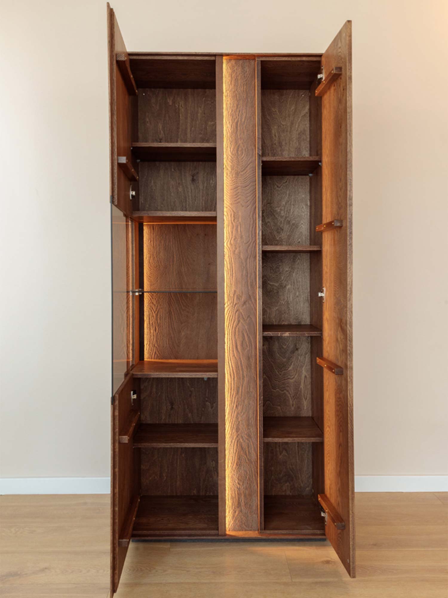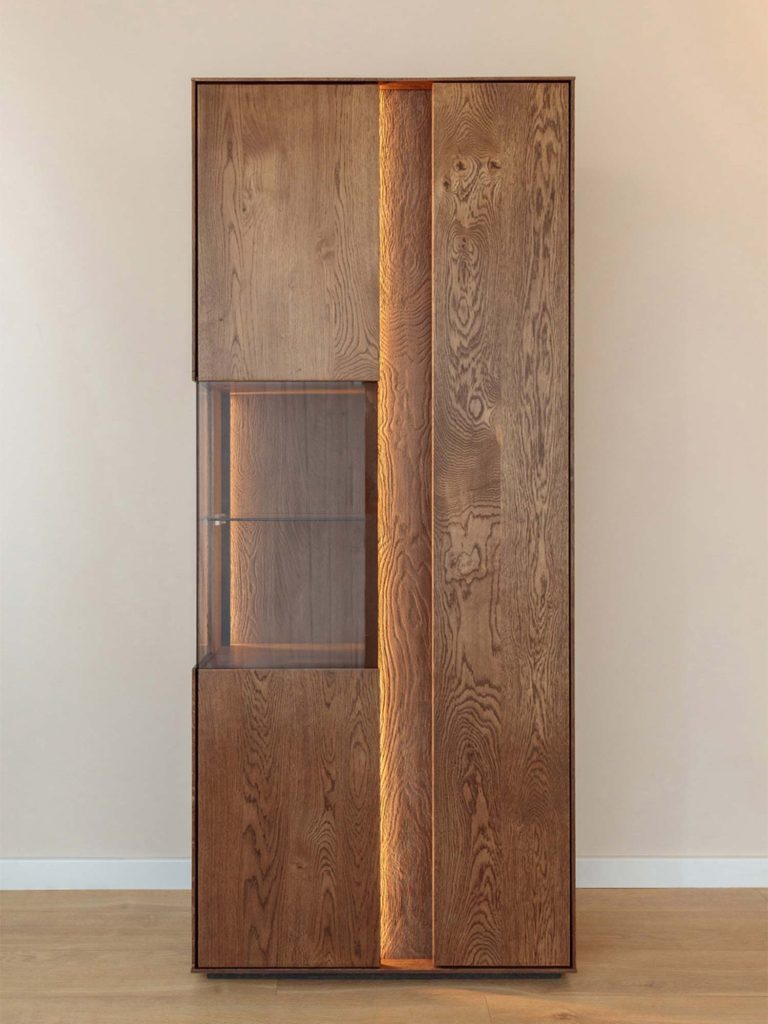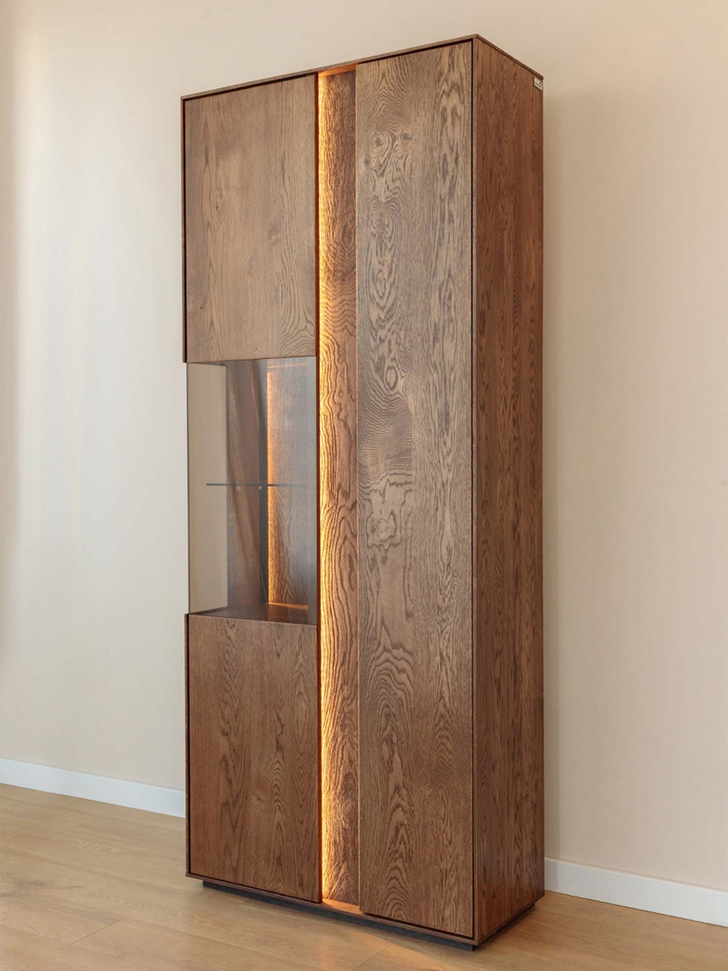 Ta podwójna wersja Essentii przyciąga uwagę i porządkuje przestrzeń. Wysokiej klasy wykończenie olejem wydobywa piękno dębu, a wbudowane oświetlenie LED podkreśla ekspozycję. Dzięki systemowi tip-on drzwi otwierają się lekkim dotykiem — bez uchwytów, bez zbędnych detali, za to z wyraźnym efektem „wow”.